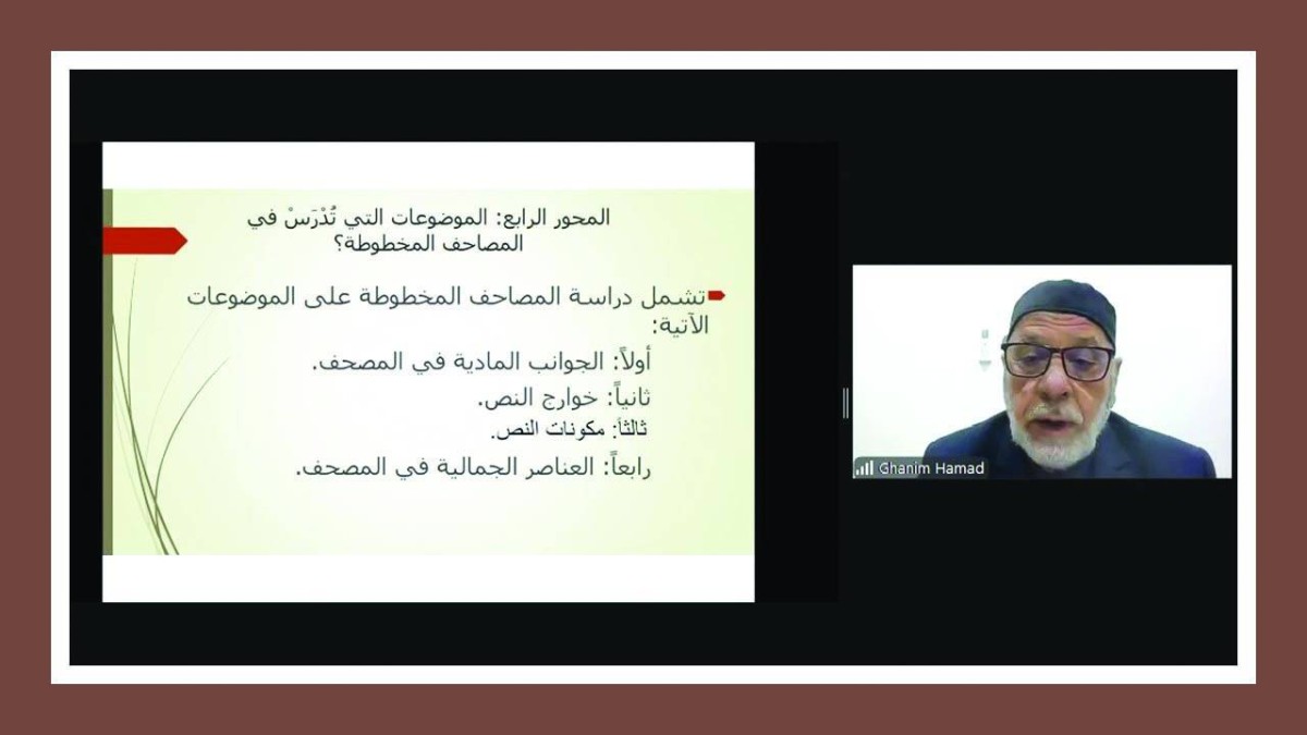 نظّم مركز جمعة الماجد للثقافة والتراث في دبي، الإثنين، ضمن برنامجه الثقافي الرمضاني، محاضرة افتراضية بعنوان «الاتجاهات المعاصرة في البحوث المتعلقة بالمصاحف المخطوطة»، قدّمها الدكتور غانم قدوري الحمد، أستاذ الدراسات القرآنية بجامعة تكريت في العراق، وشهدت حضوراً مميزاً تجاوز مئة باحث ومهتم بهذا المجال.