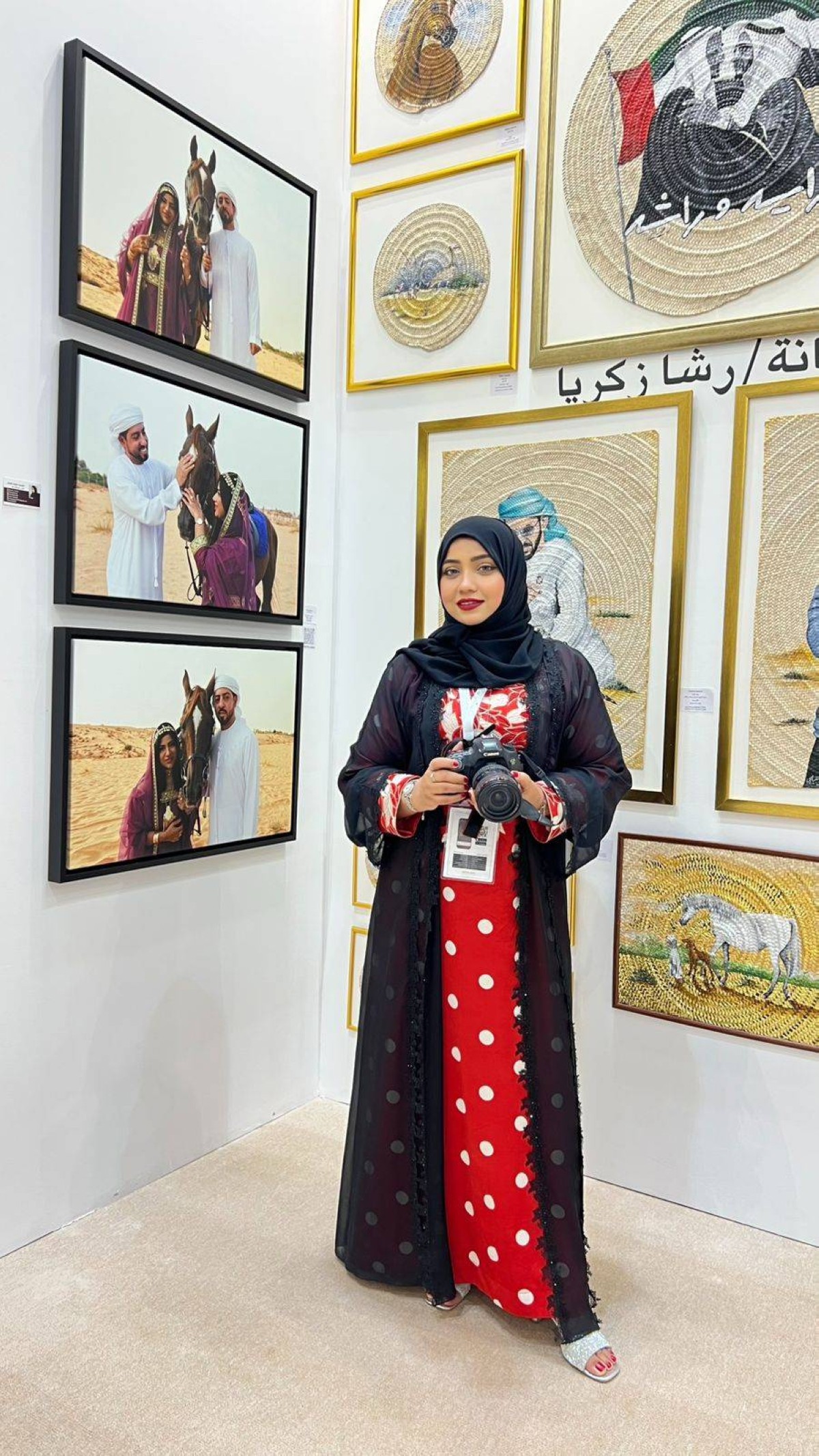 وفي سياق حديثها عن أعمالها، أوضحت أن الصورة الثانية المعروضة في المعرض، هي الأقرب إلى قلبها، حيث تعكس عمق العلاقة بين الإنسان والخيل في البيئة الإماراتية، ويجتمع فيها التراث بالأصالة، وسط رمال الصحراء الذهبية. وقالت إن المشهد يحمل مشاعر الوفاء والمودة والانتماء لهوية متجذرة في تاريخ الفروسية العربية، بينما يعكس الزي التراثي والبيئة الصحراوية روح المكان والتقاليد. وأضافت أن هذه الصورة، وما تحمله من ابتسامة البنت، وتواصلها مع الرجل والخيل، منحا المشهد بعداً إنسانياً حقيقياً، جعل كل مشاهد يتفاعل معه، ويعيشه وكأن قلبه جزء من الصورة.