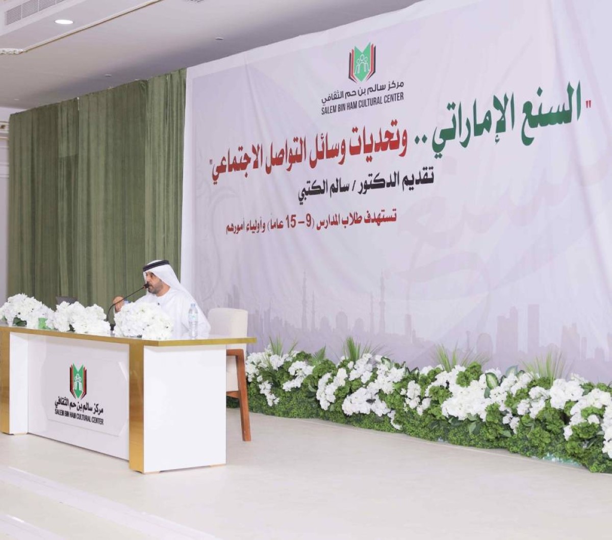 نظم مركز سالم بن حم الثقافي محاضرة توعوية بعنوان: «السنع الإماراتي وتحديات وسائل التواصل الاجتماعي»، بحضور الشيخ مسلم بن حم العامري، رئيس مجلس إدارة المركز، وعدد من طلاب مدارس العين وأولياء أمورهم.
