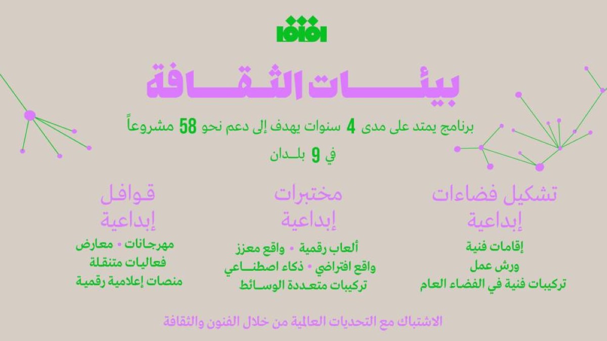 يمتد البرنامج على مدى أربع سنوات، وسيدعم نحو 58 مشروعاً في تسع دول عربية، مقدّماً تمويلاً مالياً إلى جانب فرص لبناء القدرات، تشمل: التوجيه والتبادلات بين الأقران وورش العمل والتشبيك. يتمحور البرنامج حول ثلاثة مسارات: الأول مسار تشكيل فضاءات إبداعية لدعم المشاريع الفنية التي تعيد تخيّل المساحات المشتركة وتعزز الصلات داخل المجتمعات، سواء كانت على أرض الواقع أم في الفضاء الرقمي. والثاني مسار «مختبرات إبداعية» تجمع الفنانين والعلماء وخبراء التكنولوجيا والمهنيين من مختلف القطاعات لتجربة حلول مشتركة وابتكار استجابات للقضايا العالمية المعقدة. والثالث «قوافل إبداعية» لتوسيع نطاق المحتوى الثقافي من خلال الجولات والمهرجانات والإقامات الفنية والمنصات الرقمية، مما يضمن انتقال الأعمال والسرديات الفنية عبر الحدود واللغات والمجتمعات. ومن خلال دمج هذه المسارات الثلاثة، تهدف مبادرة «بيئات الثقافة» إلى تغذية منظومات حيوية تعاونية تُصبح فيها الثقافة محركاً للابتكار والعمل الجماعي. يُفتح باب التقديم لبرنامج «بيئات الثقافة» 22 سبتمبر الجاري.