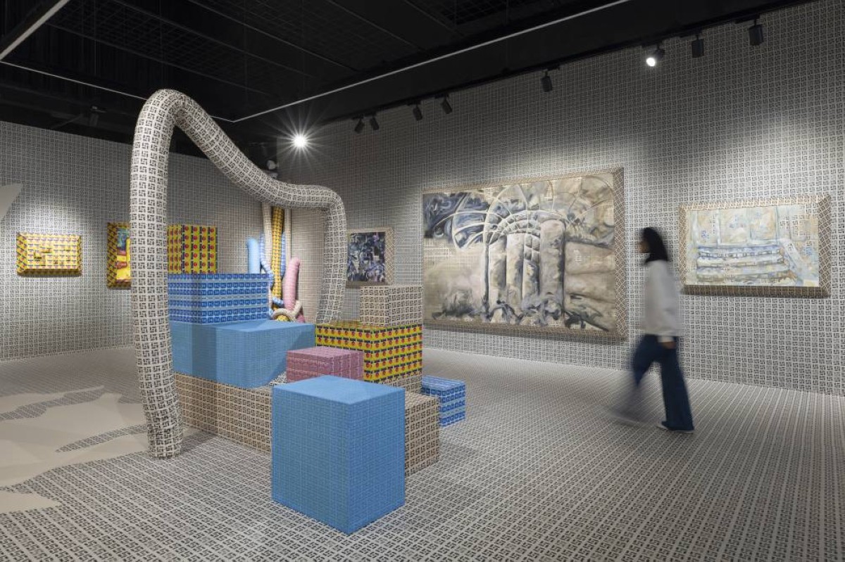 صممتُ المعرض ليكون تجربة غامرة، حيث لا يكتفي الجمهور برؤية الأعمال، بل يعيش التجربة معي. ولذلك، غطيت جميع عناصر المكان بالفينيل، حتى الأبواب ومقابس الكهرباء، لإحداث إحساس بالاندماج الكامل. كما أنني أستوحي لوحاتي من تفاصيل معمارية مرتبطة بطفولتي، وأحولها إلى أنماط تتقاطع مع الذكريات وتتفاعل معها. وكذلك، استخدمتُ أنابيب تعبيرية ترمز إلى تدفق الزمن وتشابك الذكريات، إلى جانب المنحوتات التي تمثل «كتل الذاكرة» المتراكمة عبر السنين.