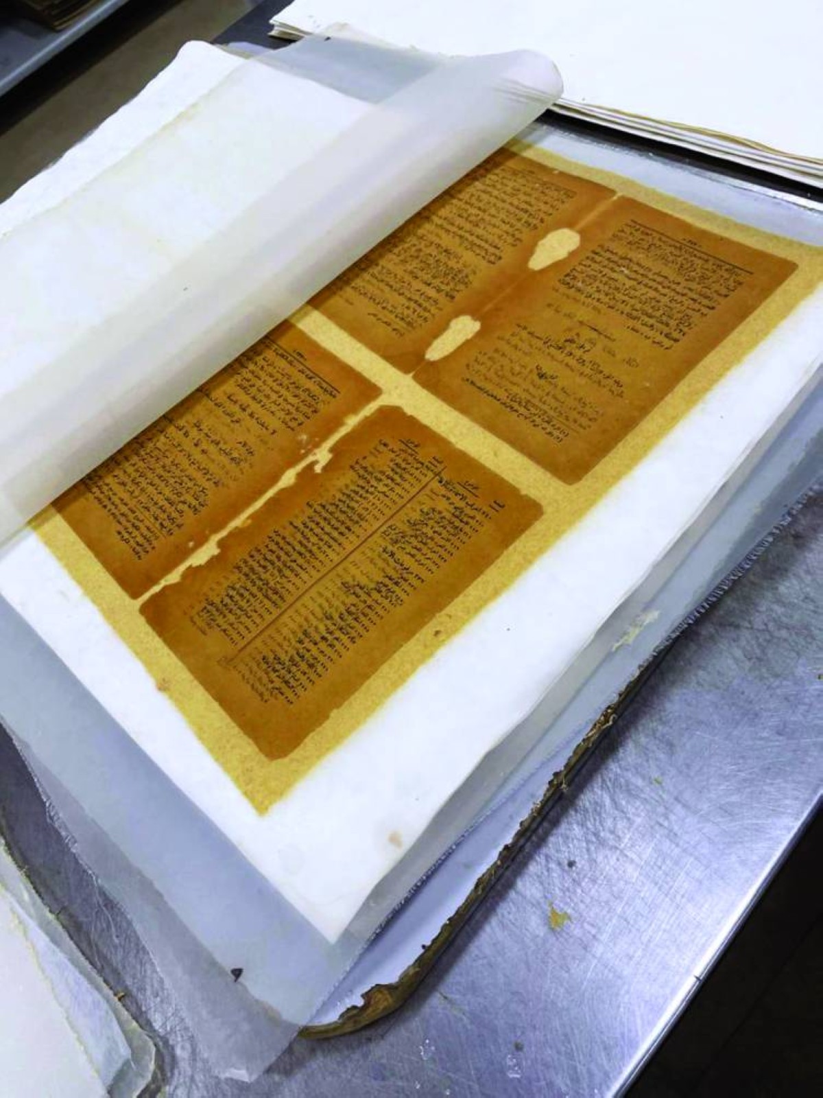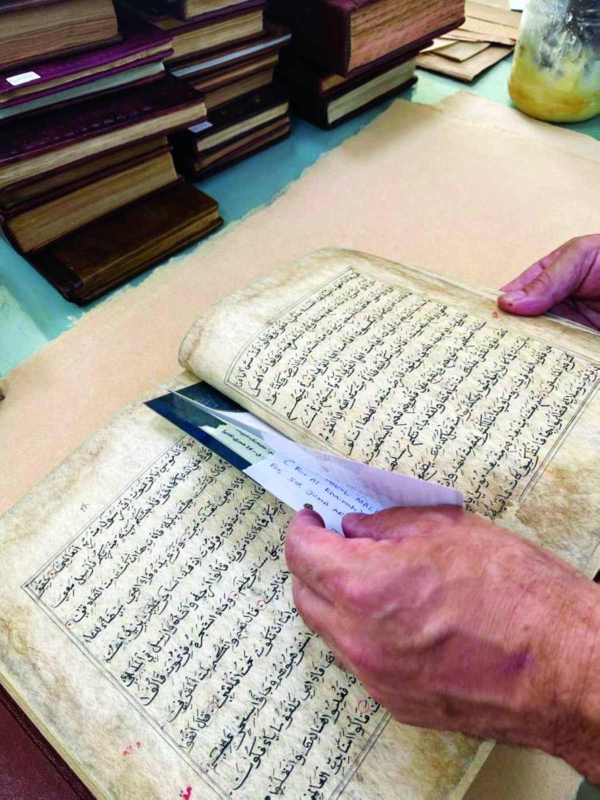 مبيناً الفروق الجوهرية بين التعامل مع كلٍّ من المخطوط والمطبوع. وأوضح الدالي أن التعقيم هو الخطوة الأولى التي يليها التنظيف الجاف إما يدوياً بالفرشاة وإما آلياً بواسطة جهاز مخصص، ثم يأتي دور عملية الترميم يدوياً أو آلياً.
