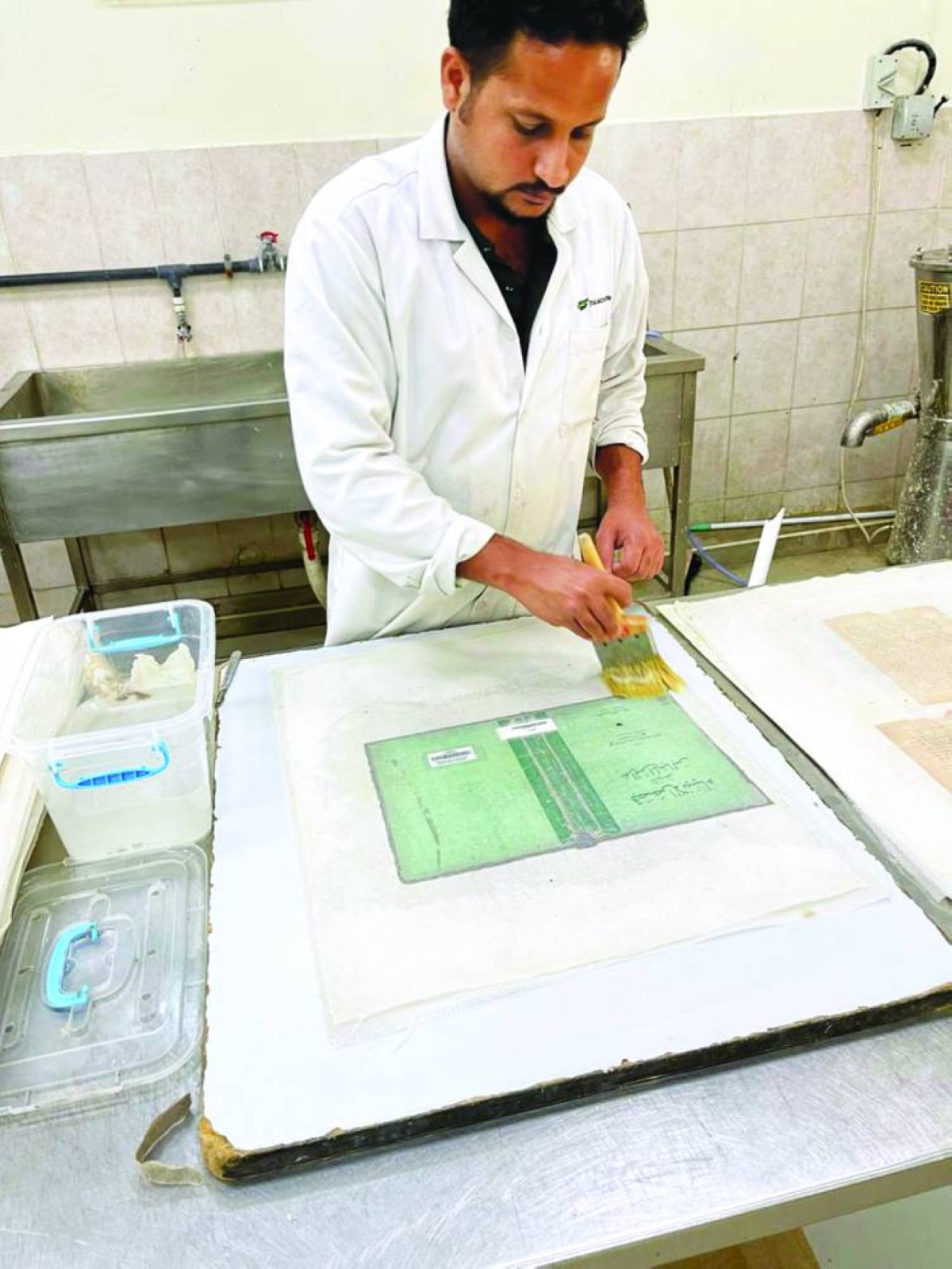 موضحاً أن معدل صفحات المطبوعات المرمَّمة يبلغ 40 ألف صفحة شهريّاً، في حين تصل عدد الصفحات المخطوطة إلى نحو 7 آلاف، نظر اً للوقت الأطول الذي يستغرقه التعامل مع المخطوطة التي قد تكون هي النسخة الوحيدة لكتاب معيَّن.
