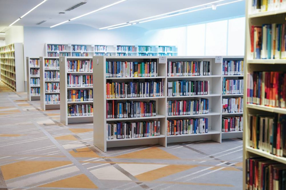 وطاولات مجهزة بمنافذ طاقة لشحن الأجهزة الإلكترونية، إلى جانب مناطق مفتوحة ومغلقة تتيح بيئة هادئة ومهيأة للتركيز. كما تراعي المكتبة احتياجات أصحاب الهمم من خلال تصميم يوفر سهولة الحركة والتنقل، من خلال منحدرات وممرات مخصصة، ومساحات مناسبة للكراسي المتحركة. وتحتضن المكتبة مجموعة كبيرة من الكتب في مجالات أكاديمية ومهنية معاصرة.