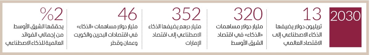 وتشير إحصاءات الشركة أيضاً إلى أنه من المتوقع أن يحقق الشرق الأوسط %2 من إجمالي الفوائد العالمية للذكاء الاصطناعي بحلول عام 2030، أي ما يعادل نحو 320 مليار دولار. ومن المتوقع أن يضيف الذكاء الاصطناعي ما يقرب من 13 تريليون دولار إلى الاقتصاد العالمي بحلول عام 2030.