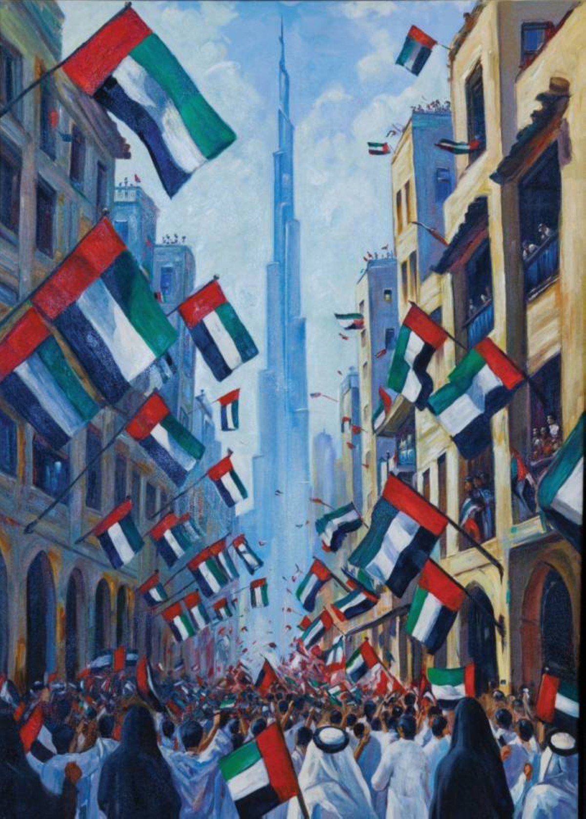 وتخلّد الرموز الوطنية والقيم الأصيلة، لتتنفس لوحاتهم سحر الأماكن، وترتدي حُللاً بديعة، فيغدو الفن حينها مرآة صادقة تعكس العلاقة بين الإنسان الإماراتي ووطنه.