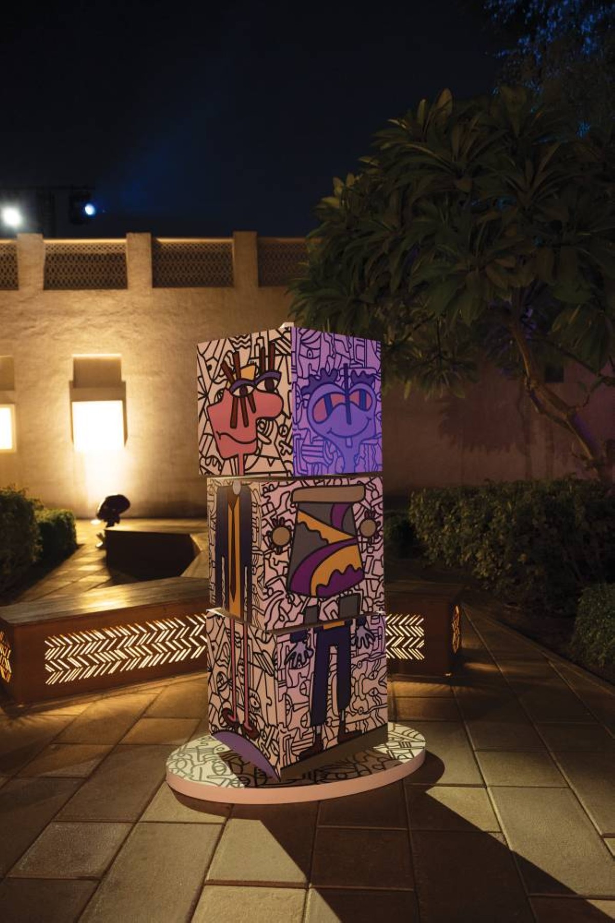 وبالمقابل، تقدم الفنانة الإماراتية هند المريد عملاً تركيبياً فنياً وتفاعلياً، تحت عنوان «كوّن صديقاً»، ويمثل دعوة لزوار منطقة الشندغة إلى إنشاء أصدقائهم الخياليين من خلال تدوير ودمج ثلاث مكعبات. وفي عمل تركيبي آخر يحتفي عمل قدمه الفنانان الإماراتيان جاسم النقبي وحمد المطوع، وحمل اسم «لمّة الكجوجة»، بفن صناعة التلي.