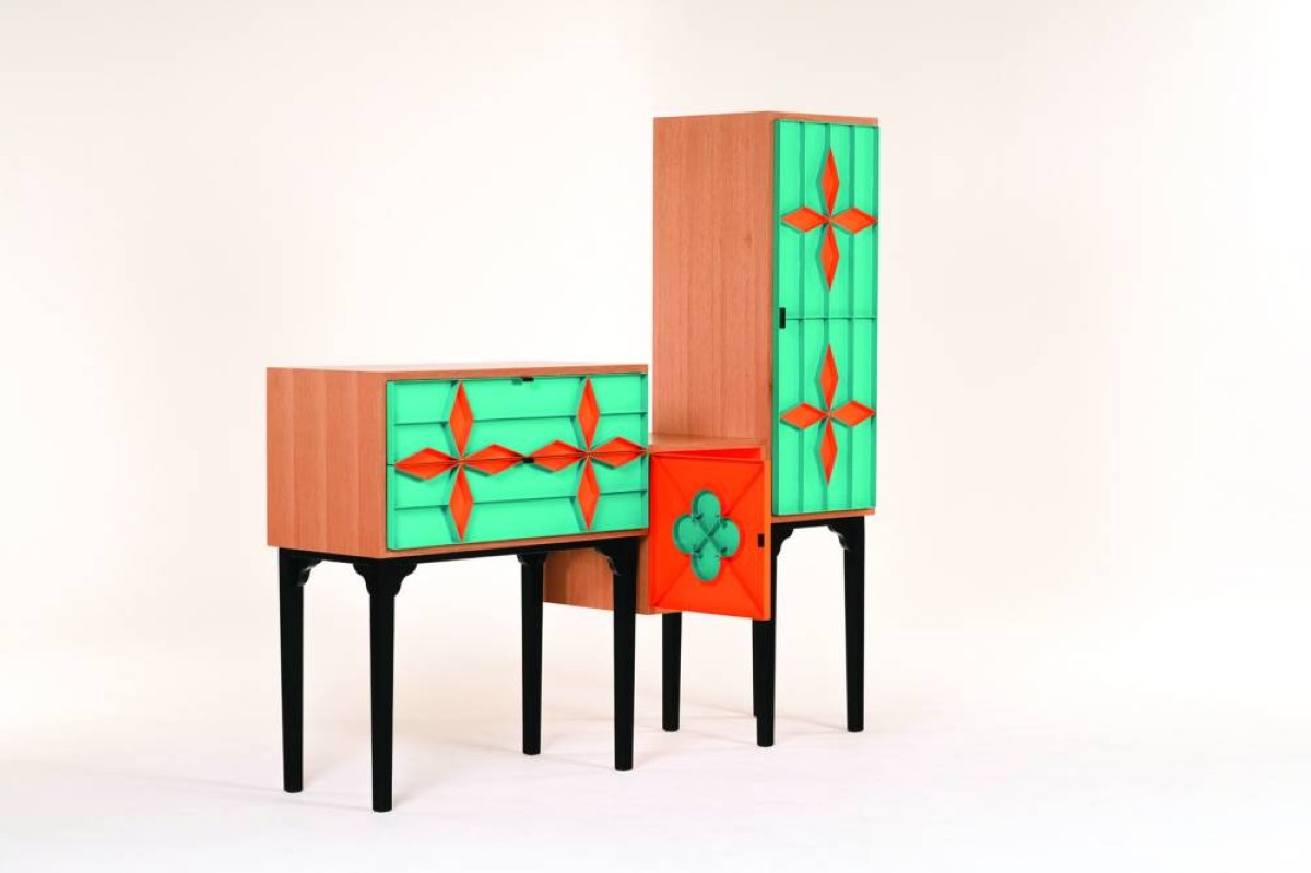 وتشتمل هذه القطع على مصباح «فيء» المعلق، الذي يعتبر حل إنارة بسيطاً وعصرياً، وهو مقدم من المصممة الإماراتية خديجة المازمي، وطاولة معروضات الزينة «بو نجمة» للمصمم الإماراتي ماجد البستكي، والخزانة المفردة المصنوعة من سعف النخل المصبوغ «تليد» والمقدمة من استوديو «ون ثيرد» الفريق النشط المؤلف من ثلاث مصممات مبدعات آمنة بن بشر، دانيه ودُنى العجلان.