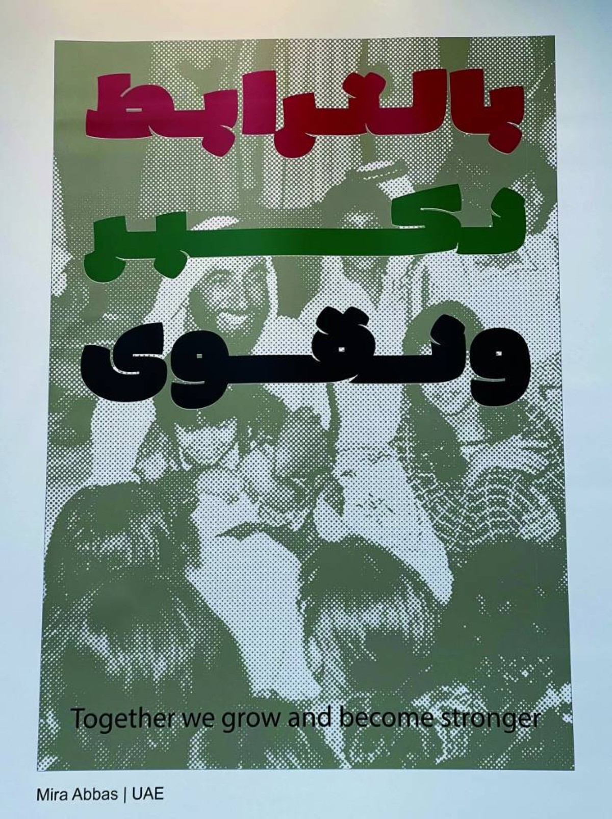 وتوضح الفنانة الإماراتية ميرا عباس، إحدى المشاركات في المهرجان بالملصق الذي يعبّر عن «عام المجتمع»، أنها وظفت ألوان علم الإمارات التي اعتمدتها في كتابة جملة «بالترابط نكبر ونقوى»، مشيرةً إلى أنها اختارت صورة القائد المؤسس المغفور له الشيخ زايد بن سلطان آل نهيان، طيب الله ثراه، مع مجموعة من الأطفال في لقطة أبوية تعكس الود والتواضع.