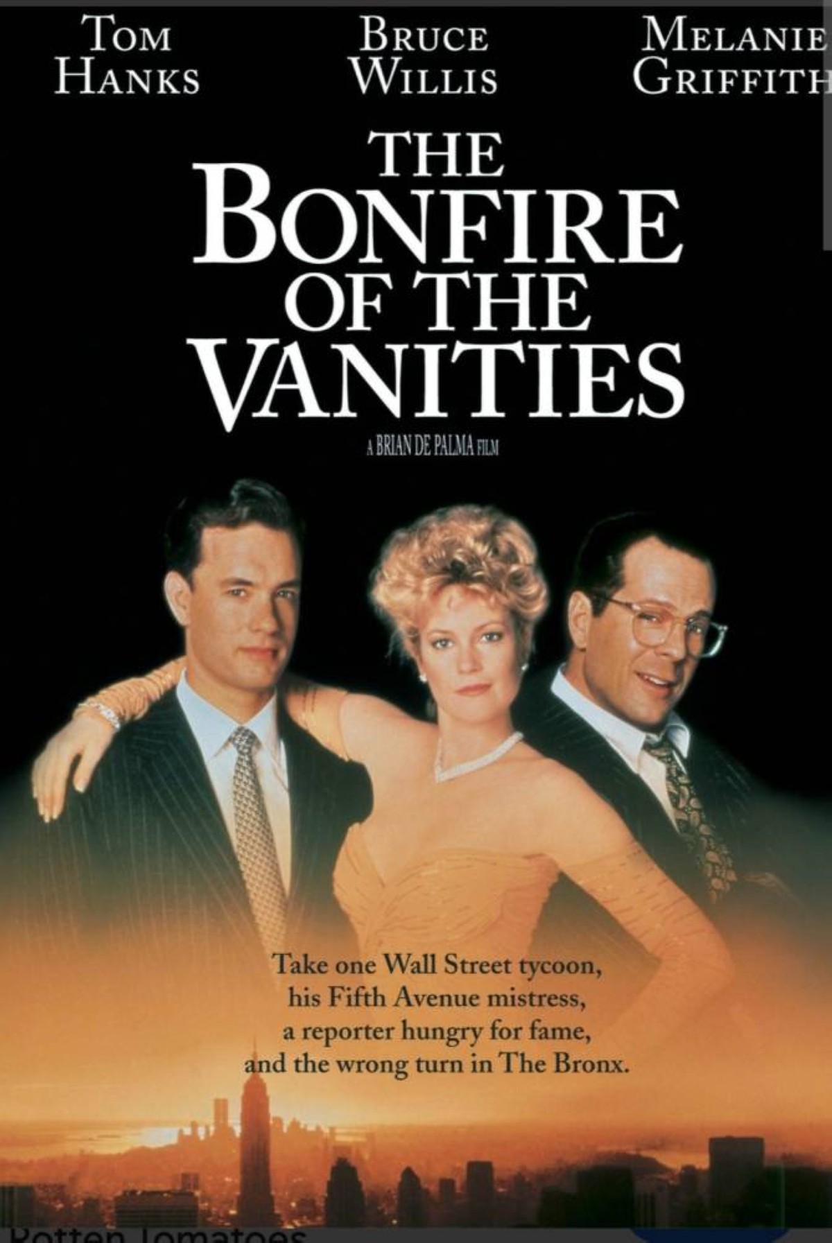 The Bonfire of Vanities عام 1990: وهو مقتبس من رواية رائعة بنفس العنوان للروائي توم وولف. وعلى ملصق الفيلم ثلاثة من كبار نجوم هوليوود آنذاك: بروس ويليس وتوم هانكس وميلاني غريفيث. والمخرج برايان دي بالما صاحب تحف سينمائية في السبعينيات والثمانينيات كان آخرها The Untouchables و «مصابي الحرب» عامي 1987 و1989 على التوالي قبل تصوير هذا الفيلم. لم يتقن الفيلم نبرة الرواية التي كانت مظلمة وساخرة وغير النبرة إلى خفيفة لا تمت لأجواء الرواية بصلة. فضلاً عن إسناد دور شخصية خبيثة إلى توم هانكس المعروف أن ملامحه لا تصلح إلا لأداء شخصية محبوبة. بشكل عام النبرة الساخرة الفاقدة لقسوة الرواية أفسدت الفيلم بشكل كامل.