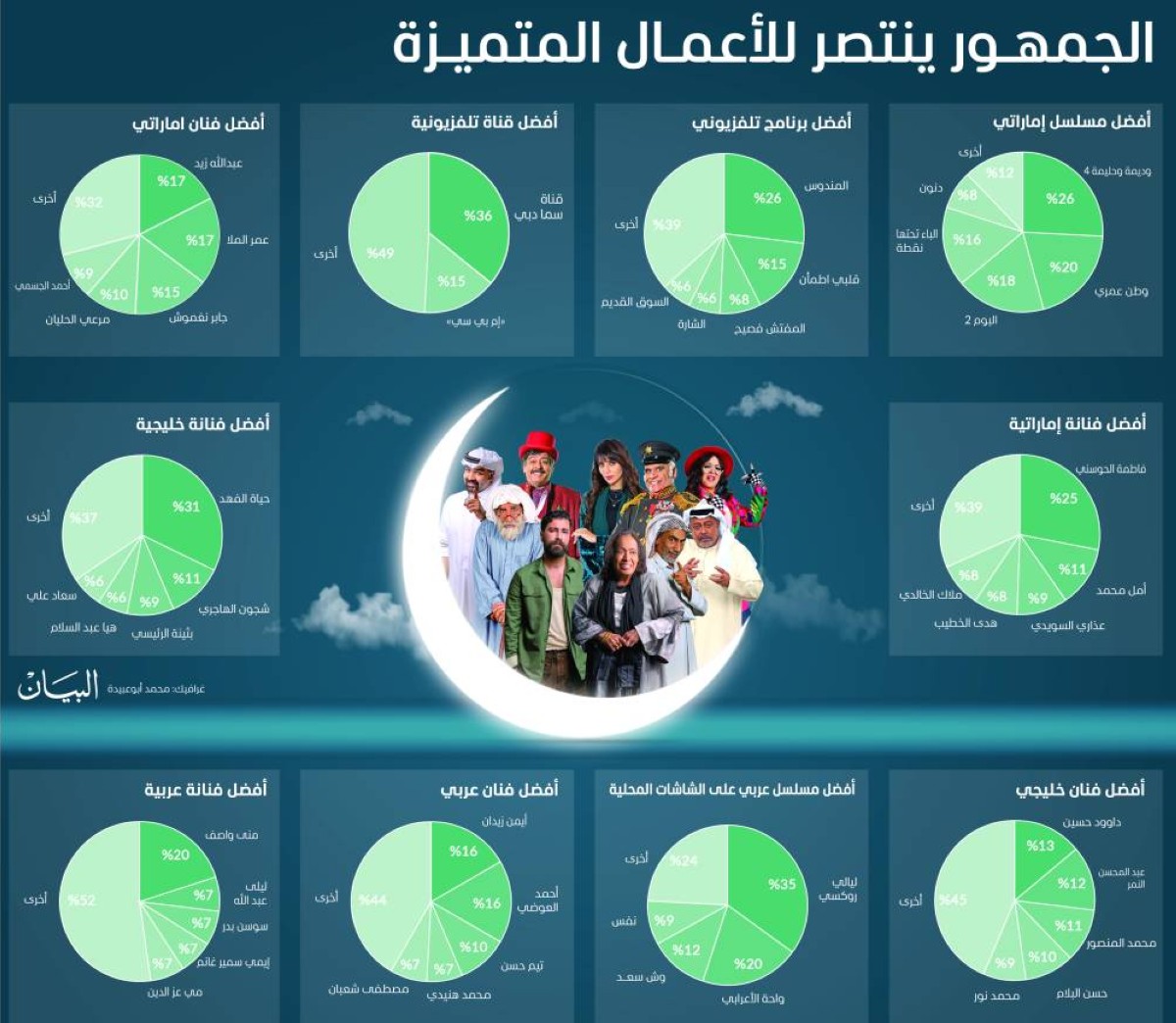 وعلى صعيد أفضل فنان إماراتي، تقاسم المركز الأول عبدالله زيد وعمر الملا بنسبة 17 % لكل منهما. وقد حقق الفنان الإماراتي عبدالله زيد الذي أطلَّ على جمهوره ومحبيه عبر المسلسل الكوميدي «دنون»، نجاحاً باهراً، خلال أدائه في العمل، كما لفت الفنان الإماراتي عمر الملا انتباه الجماهير من خلال أدائه في الجزء الثاني من مسلسل «البوم» الذي قام ببطولته، في حين حل في المركز الثاني الفنان جابر نغموش بواقع 15 %، تلاه مرعي الحليان بنسبة 10 %، ثم أحمد الجسمي 9 %، وتلاه حبيب غلوم 6 %، وتوزعت نسبة 26 % على بقية الفنانين الإماراتيين.