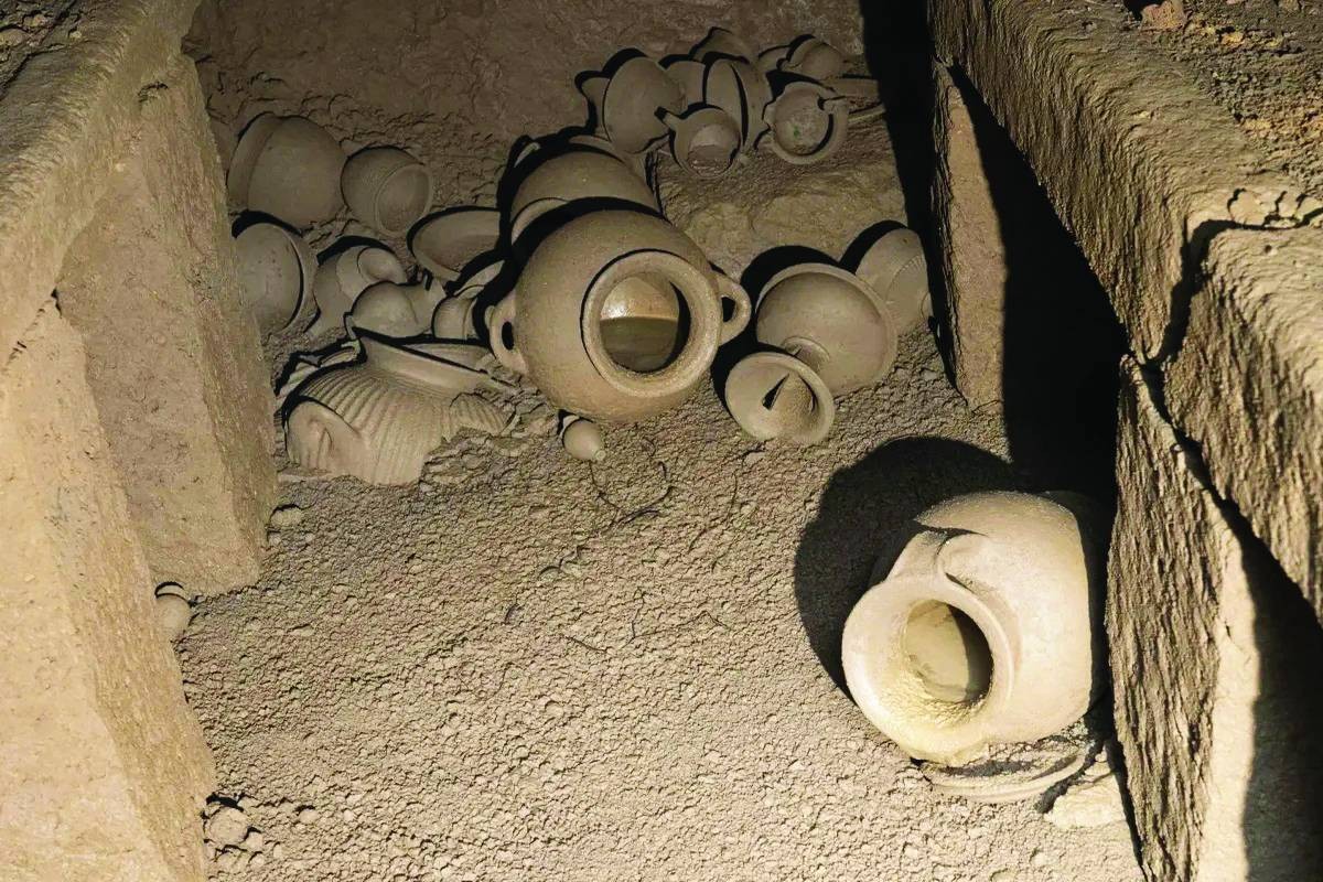 وبداخل الغرفة الصخرية المغلقة وجدت مجموعة استثنائية من القطع الأثرية المحفوظة تماماً، ومن بينها خوذتان برونزيتان متقنتان، أواني طهي، مصابيح زيتية، وأواني طعام فاخرة مزينة برسومات هندسية تعود للقرن التاسع قبل الميلاد، بالإضافة إلى أوانٍ تستخدم في طقوس الولائم الجنائزية.