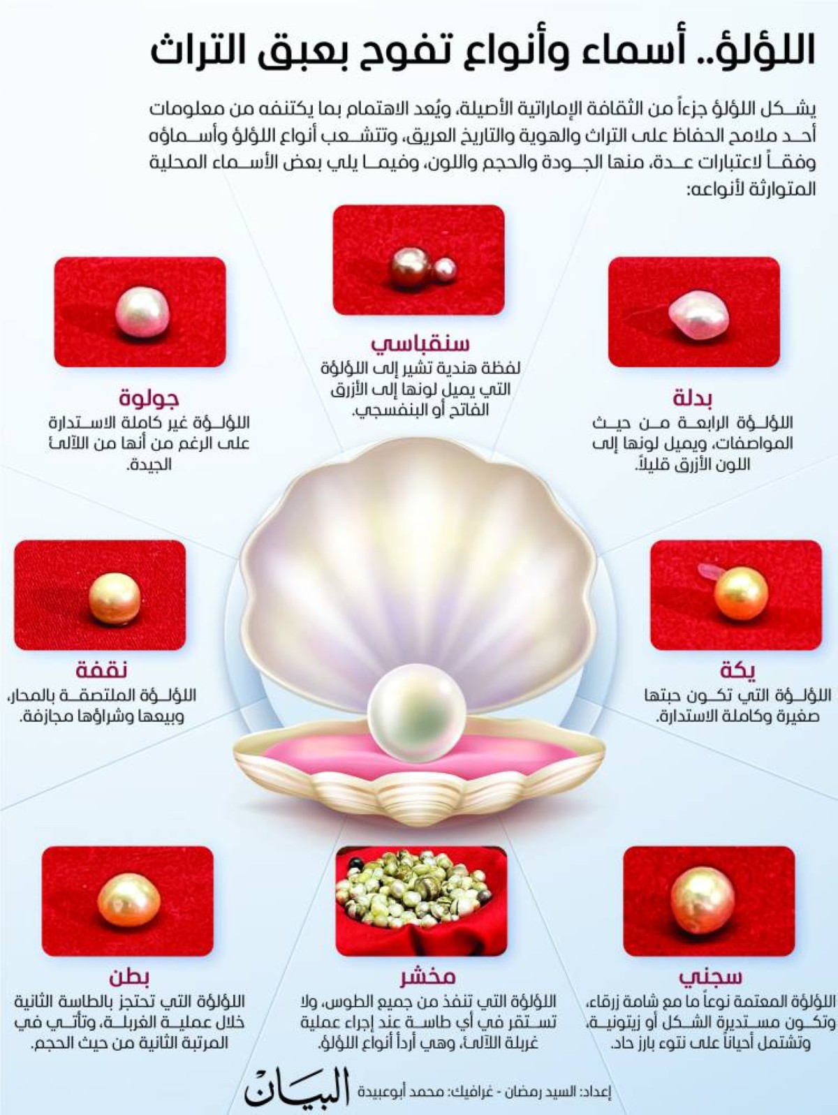 يشكل اللؤلؤ جزءاً من الثقافة الإماراتية الأصيلة، ويُعد الاهتمام بما يكتنفه من معلومات أحد ملامح الحفاظ على التراث والهوية والتاريخ العريق، وتتشعب أنواع اللؤلؤ وأسماؤه وفقاً لاعتبارات عدة، منها الجودة والحجم واللون، وفيما يلي بعض الأسماء المحلية المتوارثة لأنواعه: