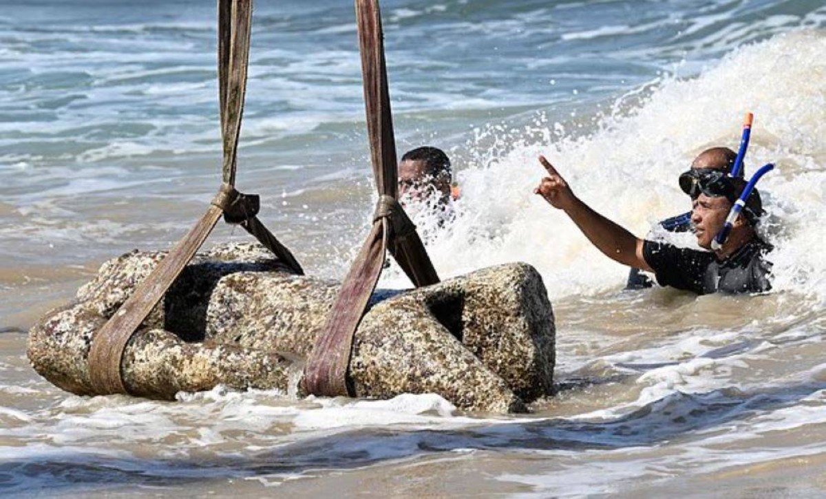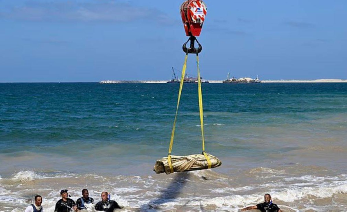 استخدم علماء الآثار والغواصون الرافعات لسحب التماثيل والبقايا من المياه في خليج أبو قير بالإسكندرية.