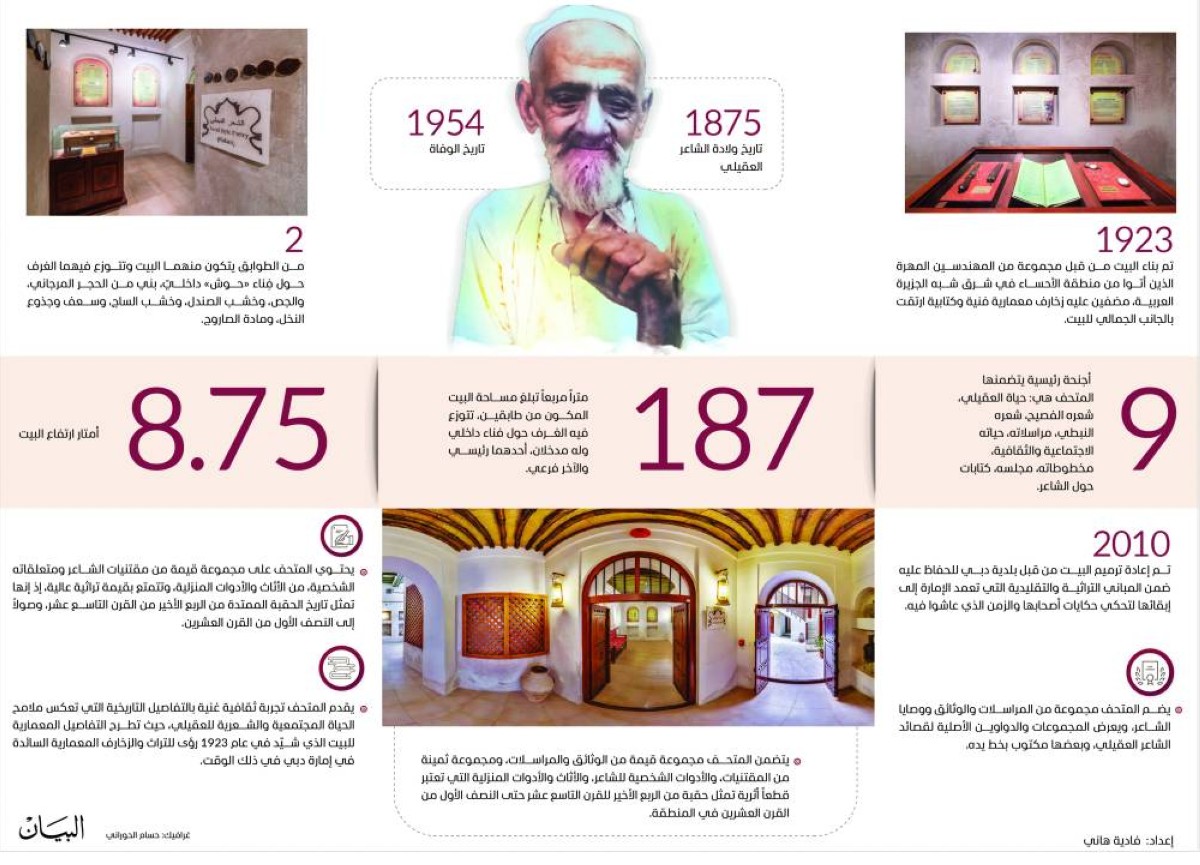 كما يمكن للزائر أن يستمتع بالعناصر والتصاميم المعمارية التراثية الجميلة التي احتواها البيت، ويتمكن من الاطلاع على وثائق ومقتنيات أصلية تعود للشاعر العقيلي، أحد أشهر شعراء المنطقة، وقد كان على تواصل وتفاعل مع الكثير من الأحداث الدولية في عصره، واستقبل فيه العديد من مشاهير زمانه، وكان محل تقدير من حكام عصره، وصاحب حظوة ومشورة لديهم.