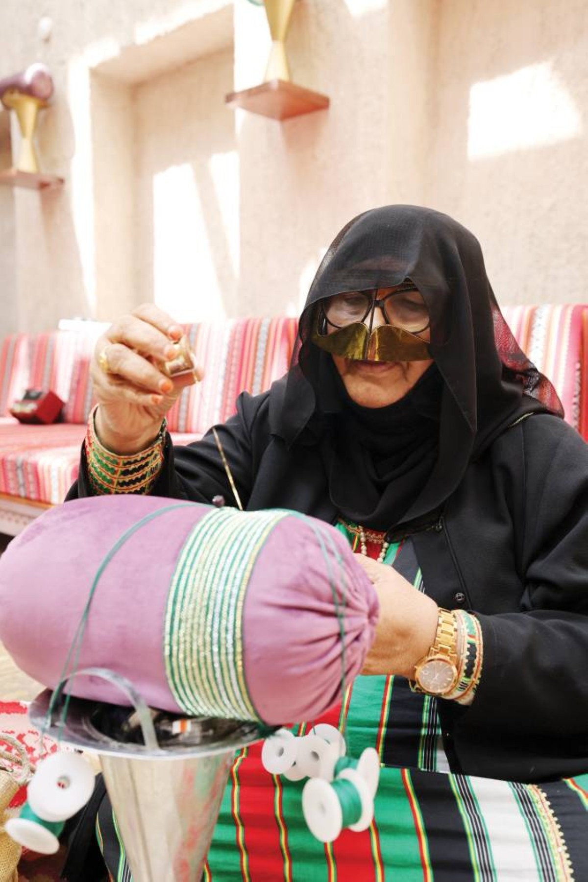 فيما تركز الدكتورة عذراء خميسة في ورشة «حلقة التلي» على تعليم زوار «بيت الحرف التقليدية» أصول وتقنيات حرفة التلي التقليدية.