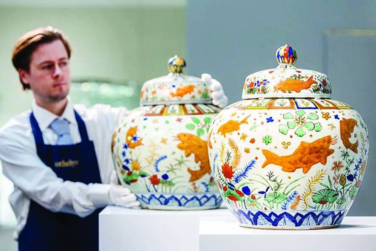 باعت دار «سوذبيز» للمزادات زوجاً من الجرار الخزفية الصينية النادرة، يعود للقرن الـ16 من عهد أسرة مينغ، والمزينة بأسماك برتقالية مقابل 12.5 مليون دولار.