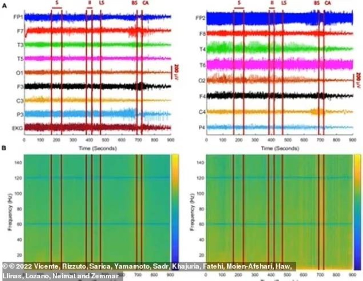 ومع ذلك، تمكن علماء الأعصاب من التقاط 900 ثانية من نشاط الدماغ حول وقت الوفاة، مما سمح لهم برؤية ما حدث في الثلاثين ثانية قبل وبعد توقف قلبه عن النبض.