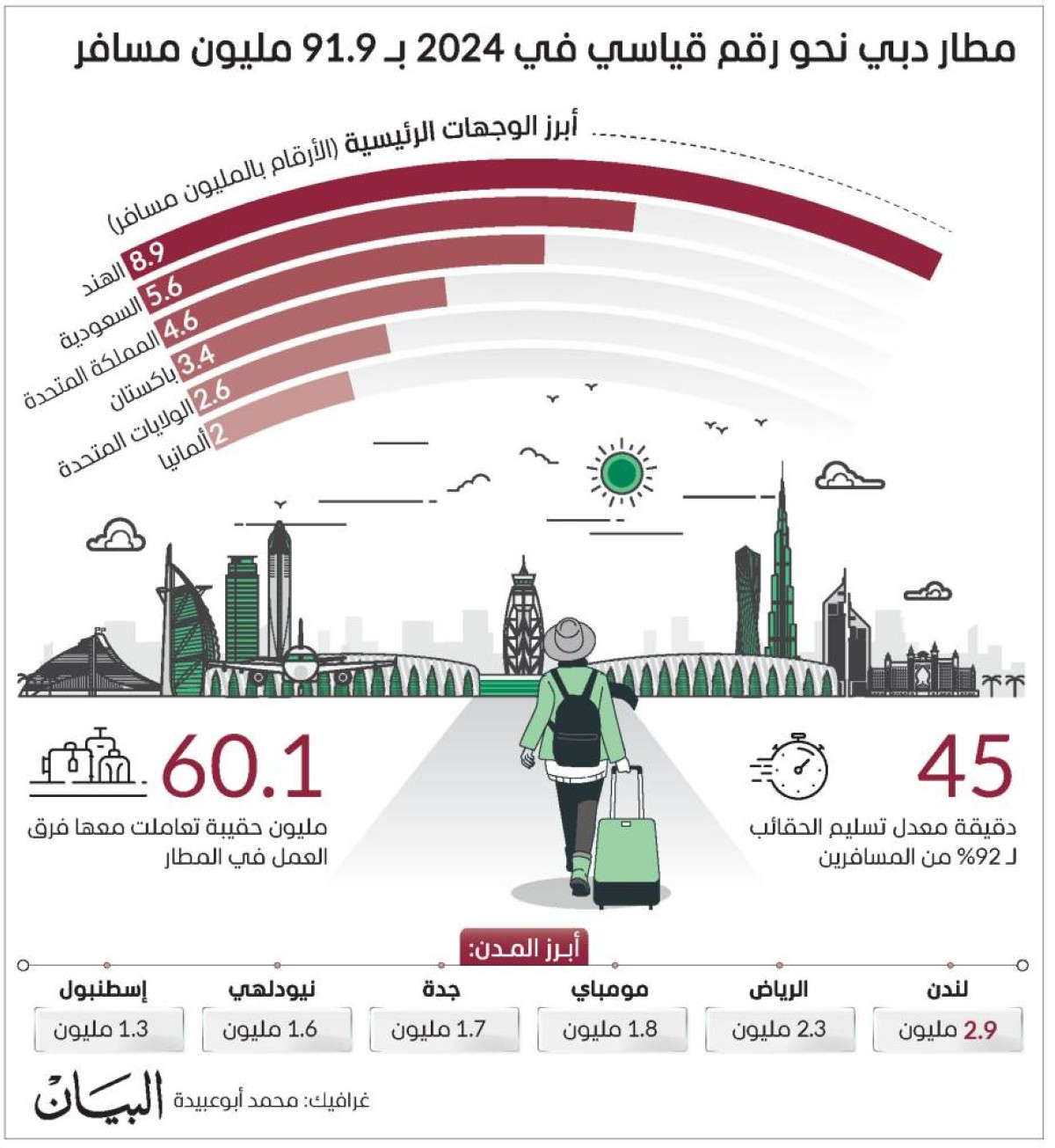 وخلال هذه الفترة، تعامل مطار دبي الدولي مع 60.1 مليون حقيبة بكفاءة عالية ومعدل دقة يعد الأفضل في قطاع الطيران بلغ 99.3%. كما تم تسليم حوالي 92% من حقائب المسافرين القادمين في غضون 45 دقيقة من وصول الطائرة إلى المدرج.