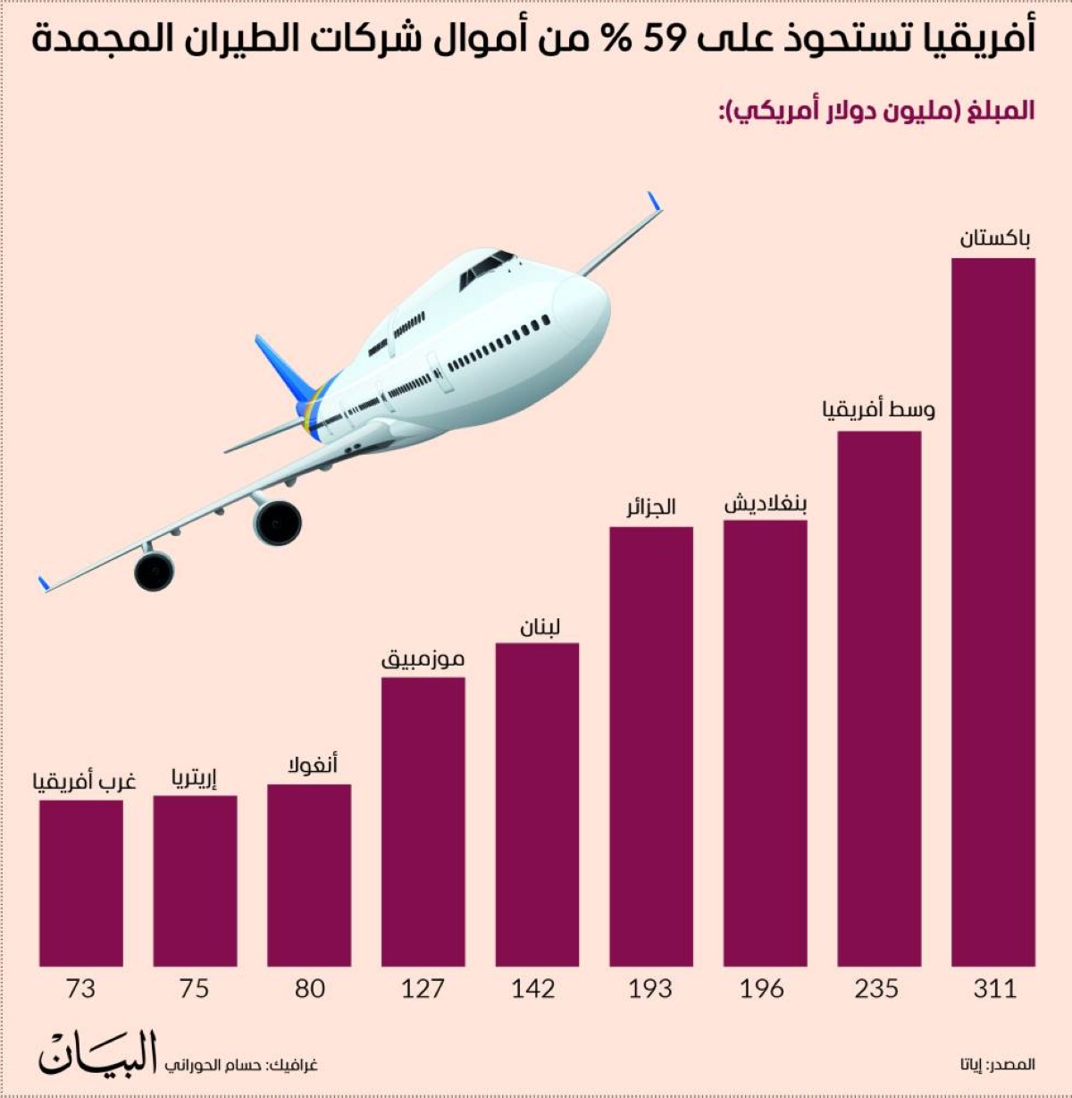وتبلغ أموال شركات الطيران المجمدة الموجودة في الدول الأفريقية ما يقارب مليار دولار، وهذا يمثل نحو 59% من الإجمالي العالمي. وخلال الأشهر الستة الماضية، كان هناك انخفاض كبير في الأموال المجمدة في الجزائر (193 مليون دولار مقارنة بـ286 مليون دولار في أبريل)، وإثيوبيا (43 مليون دولار مقارنة بـ149 مليون دولار في أبريل)، في الوقت نفسه، أسهمت منطقة الفرنك الأفريقي لوسط أفريقيا (+84 مليون دولار)، موزمبيق (+84 مليون دولار) ومنطقة الفرنك الأفريقي لغرب أفريقيا (+73 مليون دولار) في أكبر الزيادات.