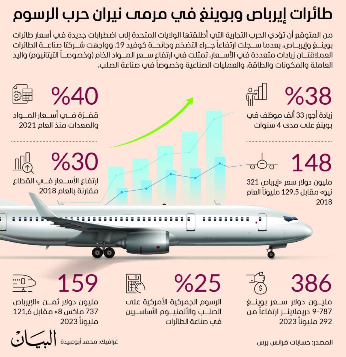من المتوقع أن تؤدي الحرب التجارية التي أطلقتها الولايات المتحدة إلى اضطرابات جديدة في أسعار طائرات بوينغ وإيرباص، بعدما سجلت ارتفاعاً جراء التضخم وجائحة كوفيد 19 .