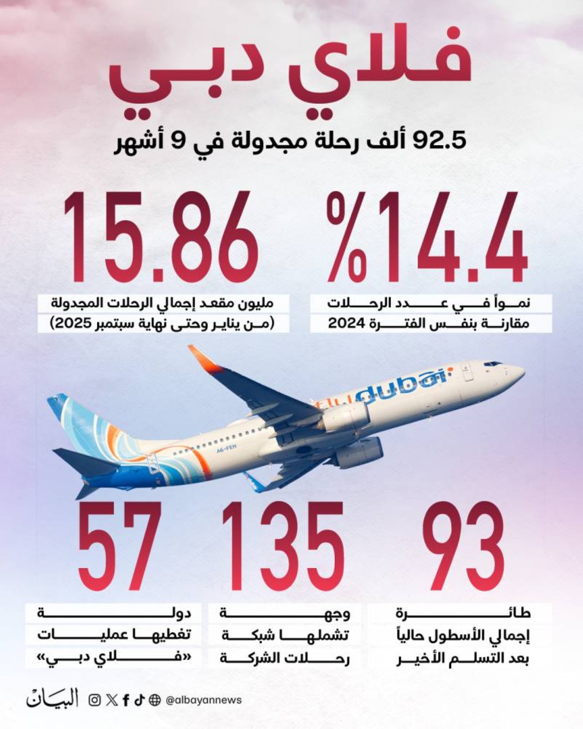 وتواصل شركة «فلاي دبي» العمل على تعزيز استمرارية نموها الاستراتيجي، من خلال تسلم سبع طائرات جديدة، حيث أفادت بيانات الشركة أنها تسلمت بين أبريل وأغسطس 2025، سبع طائرات جديدة، ما زاد إجمالي عدد الطائرات إلى 93 طائرة، ومع نهاية العام سيصل أسطولها إلى أكثر من 95 طائرة، تخدم شبكة تضم 135 وجهة في 57 دولة. ويظهر أداء «فلاي دبي» منذ بداية العام الجاري قدرة الشركة على تلبية الطلب المتزايد على السفر، حيث أسهمت زيادة عدد الرحلات في تعزيز مكانة الشركة كأحد اللاعبين الرئيسيين في قطاع النقل الجوي الإقليمي، مع توفير خيارات سفر أكثر مرونة للمسافرين من وإلى دبي.