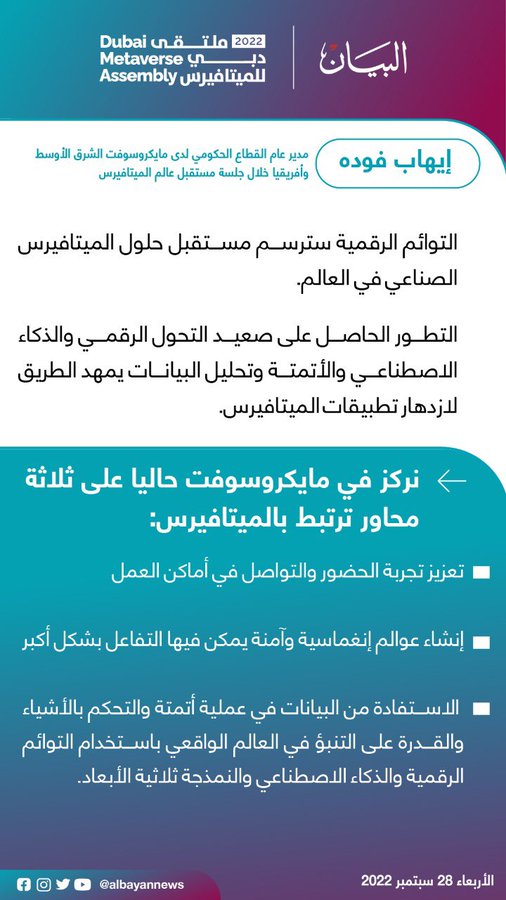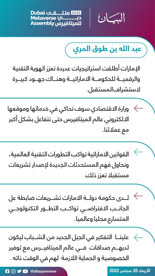 عمر سلطان العلماء، وزير دولة للذكاء الاصطناعي والاقتصاد الرقمي وتطبيقات العمل عن بعد: #الميتافيرس سيتمحور حول #دبي بفضل رؤية سمو الشيخ #حمدان_بن_محمد @DubaiFuture @OmarSAlolama #ملتقى_دبي_للميتافيرس #البيان_القارئ_دائما pic.twitter.com/zTyFVq5Lm8
