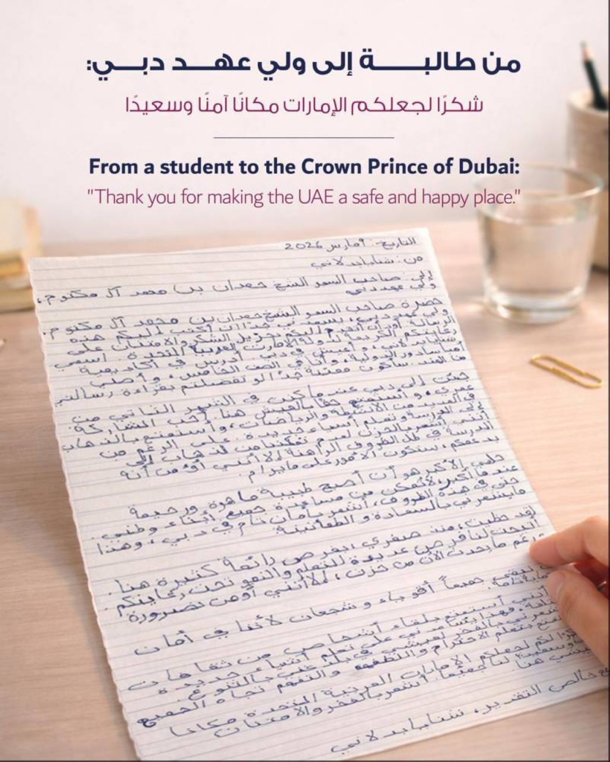 وأضافت أن مجرد تفكير طفلة في العاشرة من عمرها بكل هذه المشاعر والامتنان تجاه المكان الذي تعيش فيه يعكس نجاح دبي في غرس قيم الانتماء والولاء في نفوس أبنائها من مختلف الجنسيات، لافتة إلى أن كلماتها تختصر شعور كثيرين يعيشون في الإمارة ويتمتعون بما توفره من أمن واستقرار وفرص للنمو والتعلم، وهو ما يجعل رسالتها ذات قيمة كبيرة ومعبرة عن إحساس جمعي بالفخر والامتنان