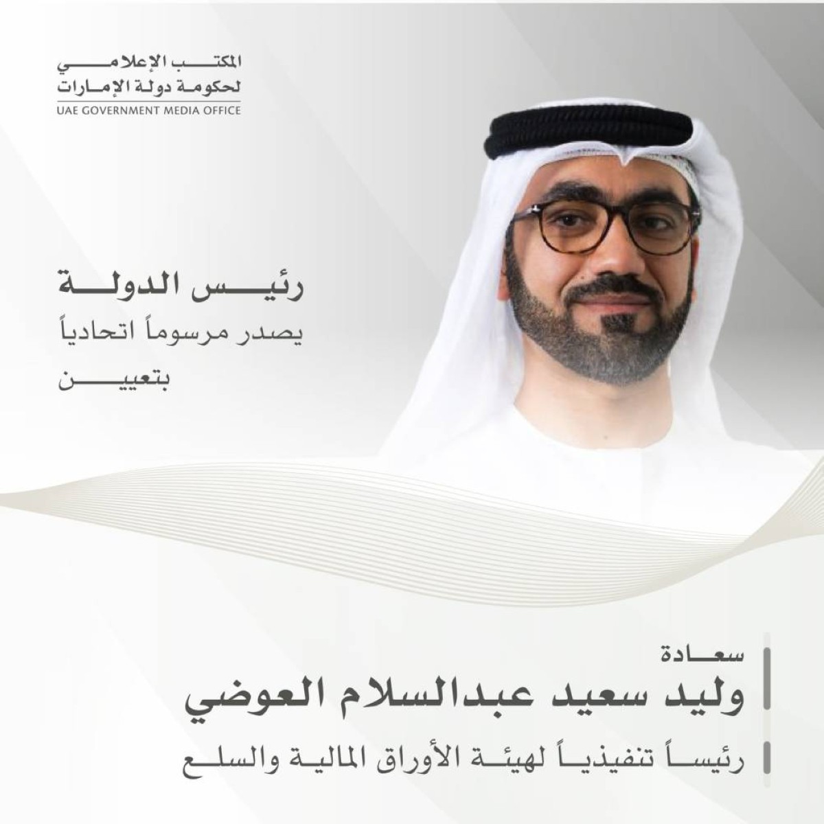 أصدر صاحب السمو الشيخ محمد بن زايد آل نهيان، رئيس الدولة، حفظه الله، مرسومين اتحاديين بتعيين وليد سعيد عبدالسلام العوضي رئيساً تنفيذياً لهيئة الأوراق المالية والسلع، بدرجة وكيل وزارة، وأحمد راشد سعيد النيادي مديراً عاماً للهيئة العامة للشؤون الإسلامية والأوقاف والزكاة، بدرجة وكيل وزارة.