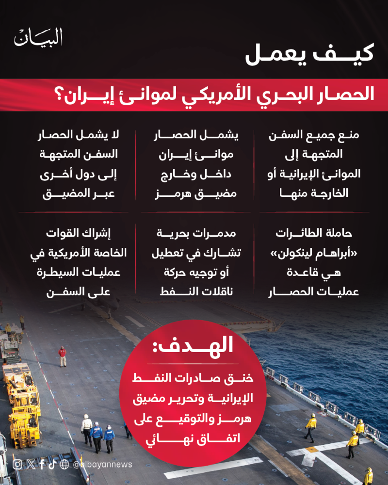 أعلن الجيش الأمريكي أنه بدأ فرض حصار على جميع السفن المتجهة إلى الموانئ الإيرانية أو الخارجة منها، بما يشمل الموانئ الواقعة خارج مضيق هرمز أيضاً، على امتداد بحر عُمان. وفي المقابل، لن يتم اعتراض السفن المتجهة إلى موانئ غير إيرانية، ما يشير إلى أن الإجراء أكثر محدودية مما لوّح به الرئيس دونالد ترامب سابقاً حين تحدث عن إغلاق شامل للمضيق.