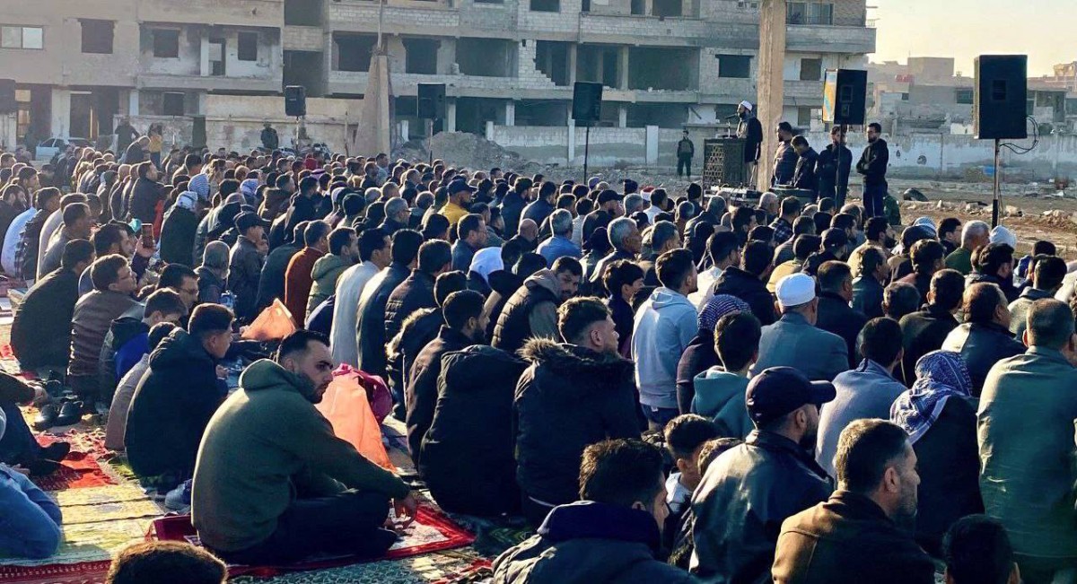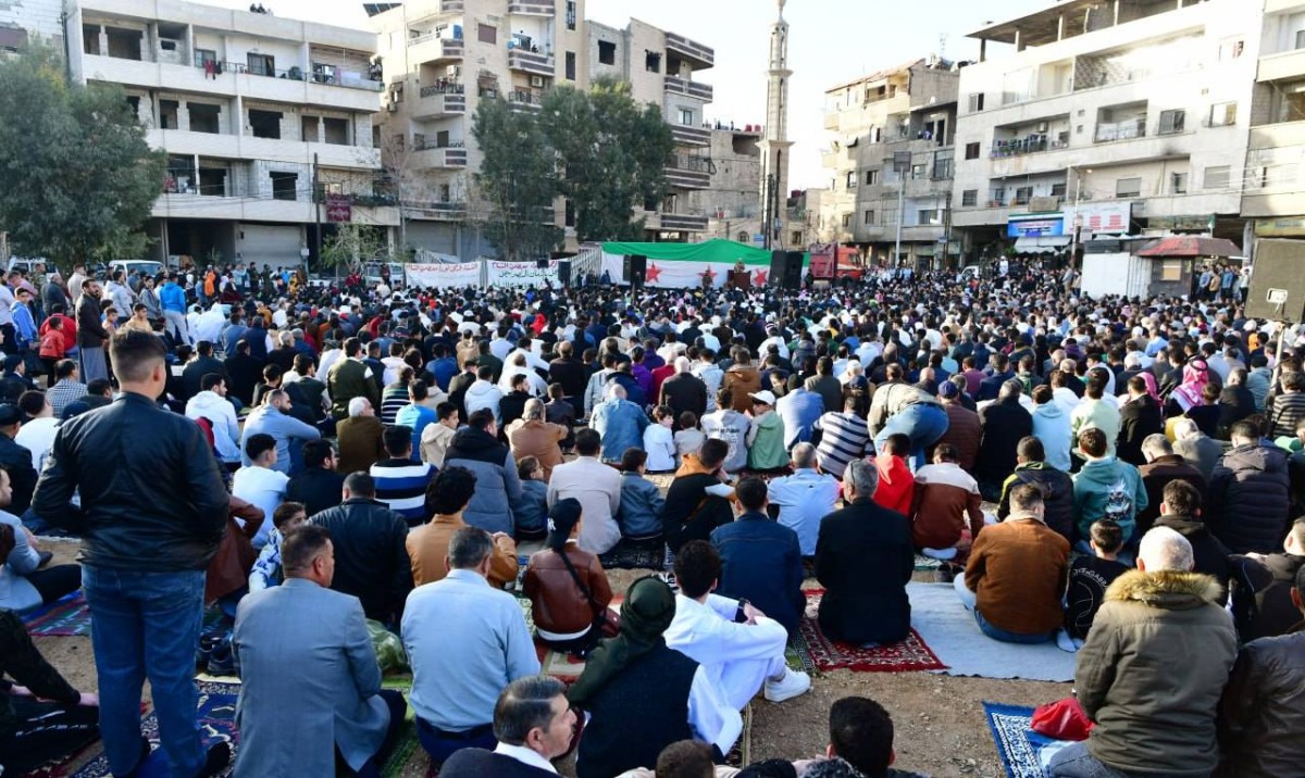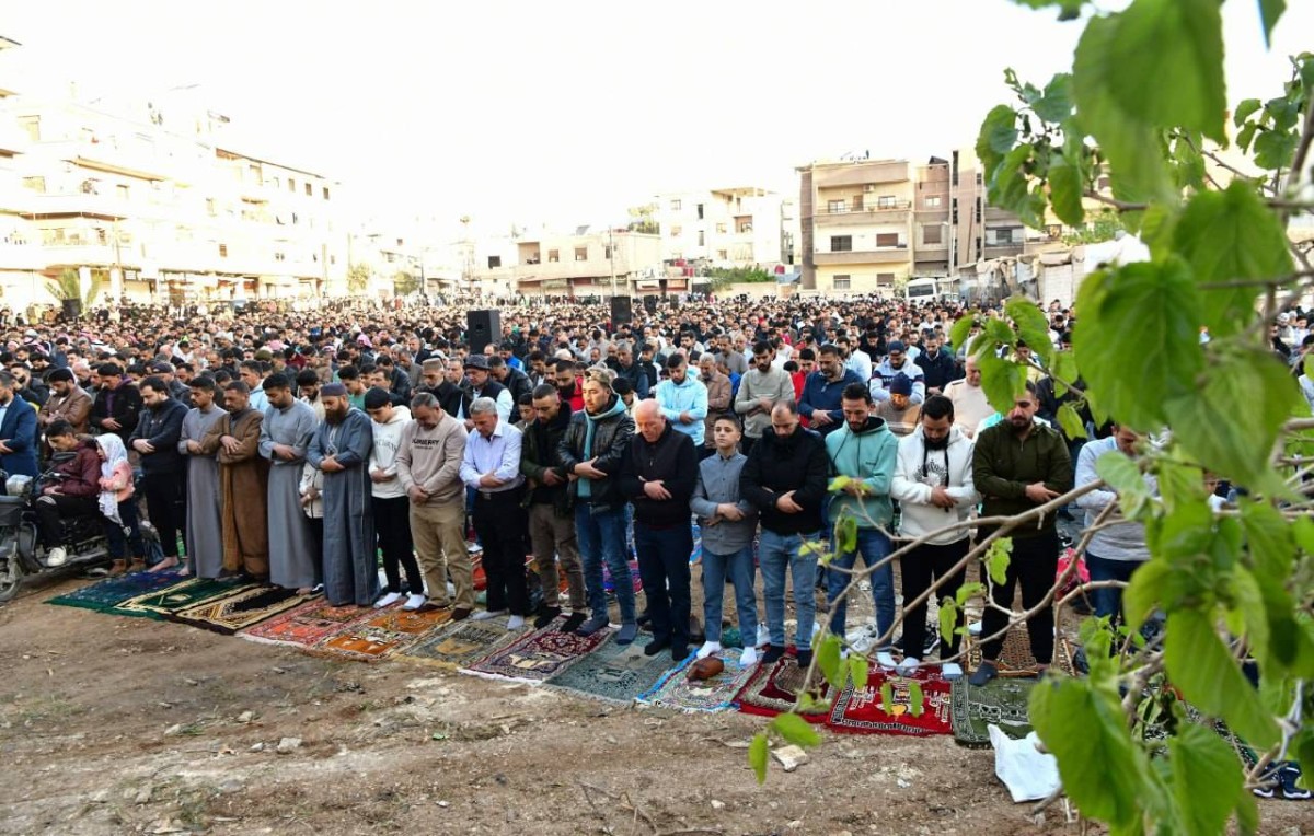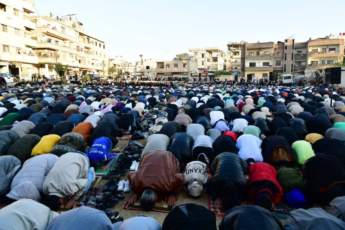 وأقام المئات من السوريين الصلاة في القصر الجمهوري برفقة رئيس البلاد أحمد الشرع والوزراء وقادة من الجيش السوري وعدد كبير من المواطنين.