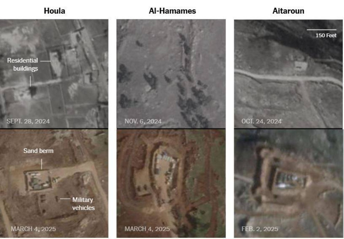 بحسب إحصائية مصادر نيويورك تايمز ومصادر إسرائيلية، أقامت تل أبيب جنوب سوريا تسعة مواقع بزعم "حماية التجمعات السكانية في شمال إسرائيل"، وبررت خطوتها بعدم ثقتها بالحكومة الجديدة في دمشق.