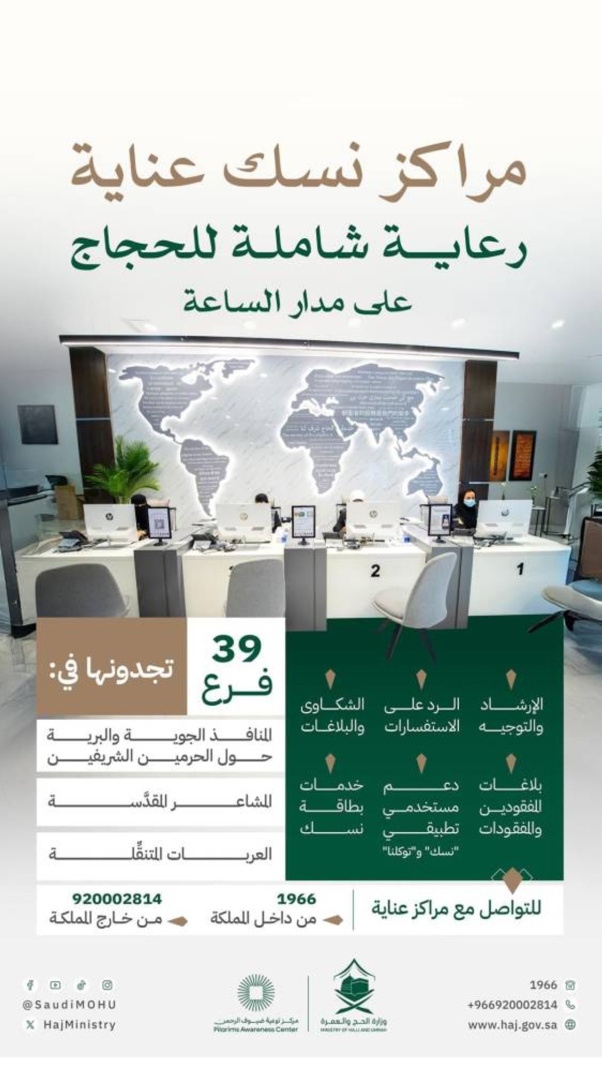 أعلنت وزارة الحج والعمرة في المملكة العربية السعودية عن توسّع مراكز "نُسك عناية" عبر أكثر من (39) مركزًا، و(142) نقطة خدمة إضافية خلال موسم الحج، في مواقع حيوية بمكة المكرمة، والمدينة المنورة، وجدة، والمشاعر المقدسة، والمنافذ البرية والبحرية والجوية، وذلك استكمالًا لعمل (15) مركزًا دائمًا تقدم خدماتها لضيوف الرحمن على مدار العام.