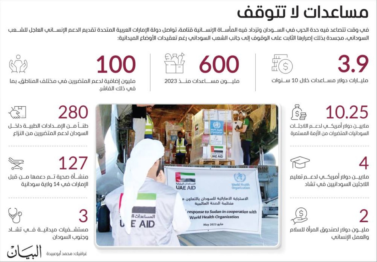 وتؤكد الإمارات دوماً، من خلال مؤسساتها الإغاثية والإنسانية، التزامها بمواصلة دعم الشعب السوداني عبر إرسال الجسور الجوية وتسيير قوافل المساعدات، إلى جانب مشاركتها في الجهود الدولية الرامية إلى تحقيق الاستقرار وإعادة الإعمار، ويعكس هذا الدور الفاعل رؤيتها الإنسانية القائمة على نشر قيم العطاء والتآخي، وترسيخ مكانتها ركيزة أساسية في العمل الإنساني الإقليمي والعالمي.