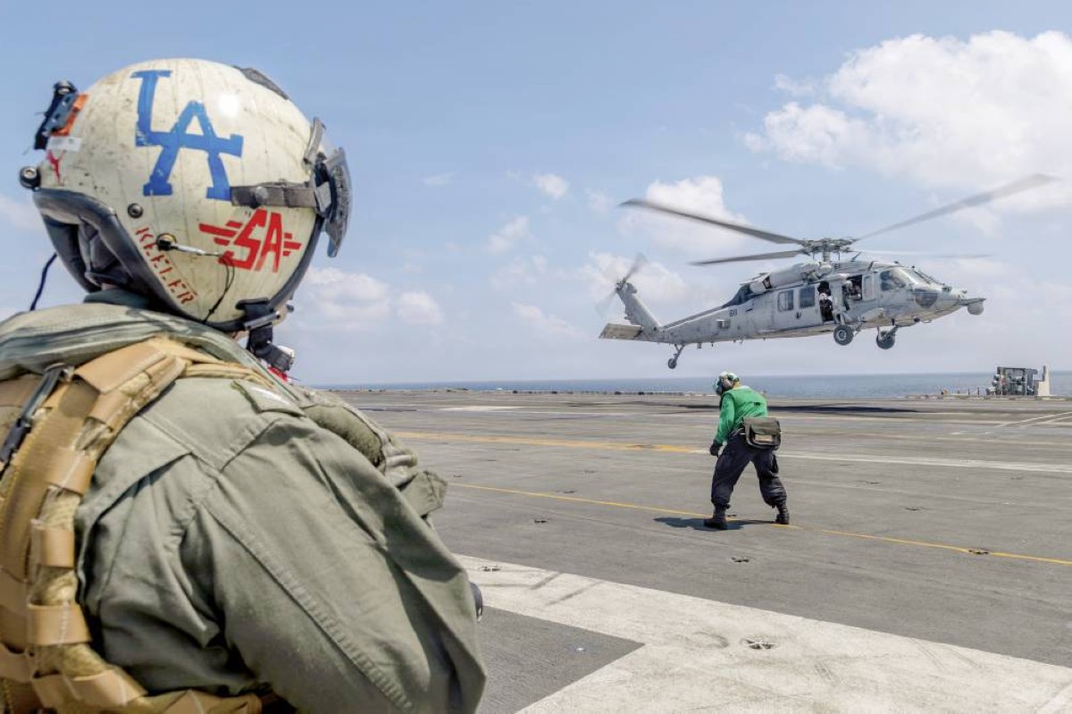 مروحية على متن حاملة الطائرات الأمريكية «يو إس إس أبراهام لينكولن» خلال إبحارها في المحيط الهندي |