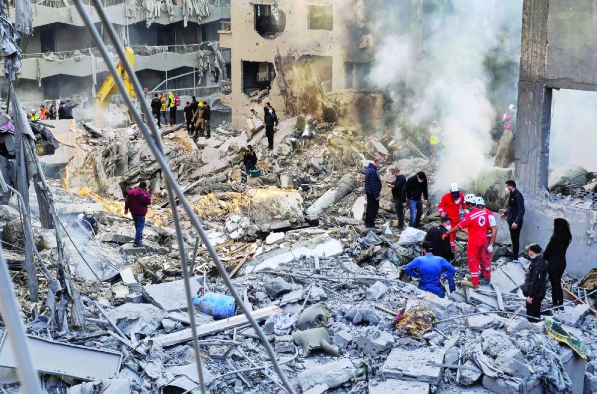 عمال إنقاذ في موقع استهدفته غارة إسرائيلية وسط بيروت أمس