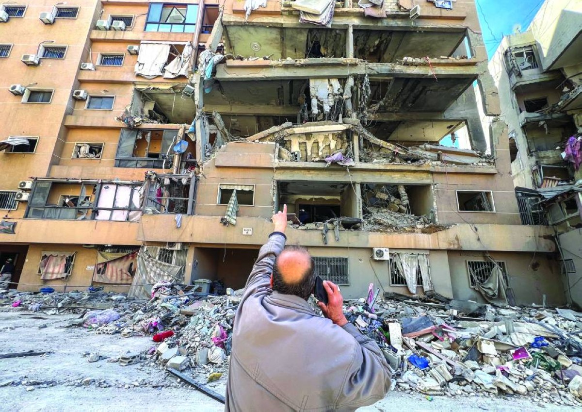 رجل يشير إلى مبنى تعرض لغارات إسرائيلية على الضاحية الجنوبية لبيروت