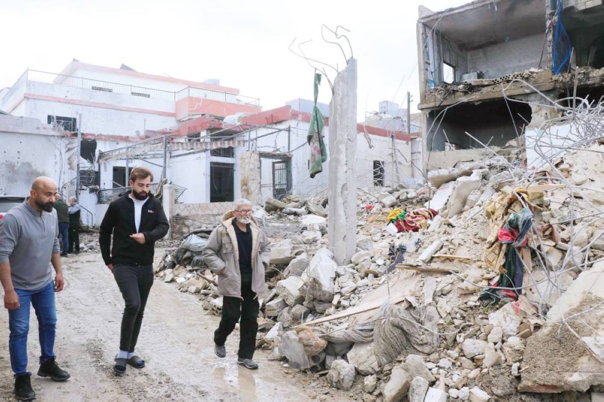 أشخاص يمرون أمام مبنى متضرر عقب غارات إسرائيلية في قرية برج رحال