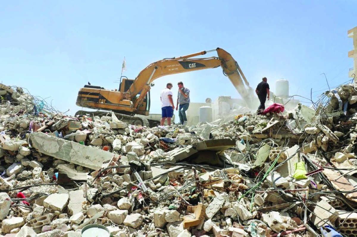 سكان يبحثون بجوار آلية تزيل أنقاض مبانٍ مدمرة في مدينة صور اللبنانية