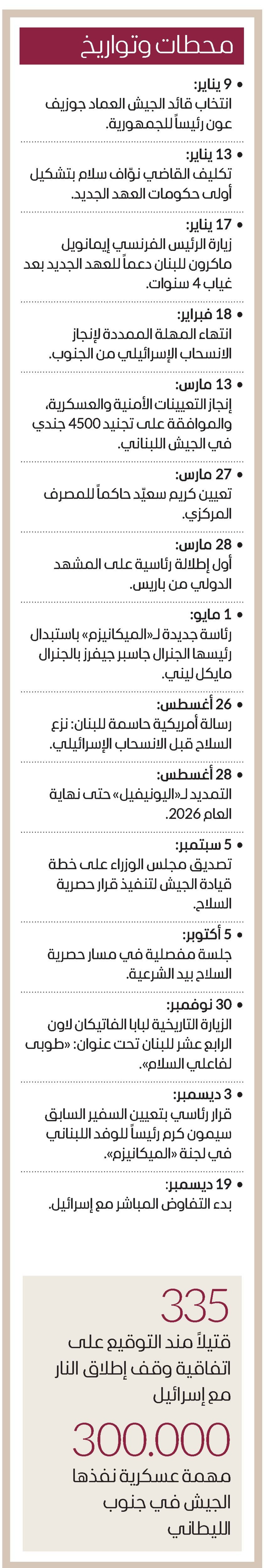 سنة انطلقت مثقلة بتركة الأزمات المتلاحقة العالقة في دوامة التعطيل، وبانتهاء فترة الـ60 يوماً من أجل إنجاز الانسحاب الإسرائيلي من الجنوب، في 27 يناير، بموجب الاتفاق المبرم لوقف الحرب في 27 نوفمبر 2024، وما بينهما تشديد القيود على دخول اللبنانيين إلى سوريا، من بوابة «إشكالية الحدود» الشرعية وغير الشرعية، معطوفةً على ملف النزوح الذي سجل تقدماً ملموساً على صعيد العودة.