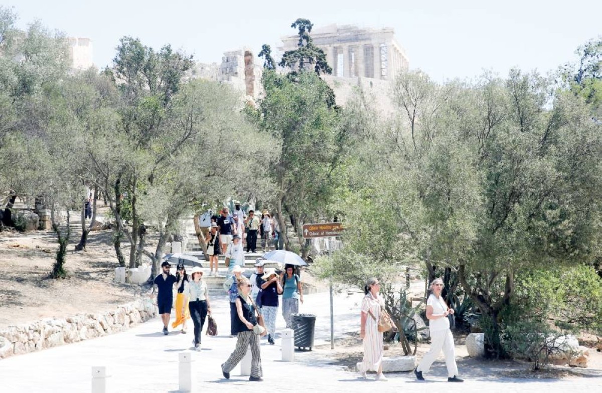 سياح يتجولون في أحد المزارات في أثينا وسط تحذيرات من موجة حرارة قياسية