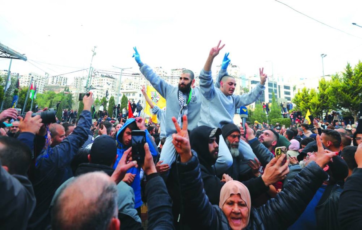 فلسطينيون يحملون عدداً من الأسرى أثناء الاحتفال بالإفراج عنهم في رام الله