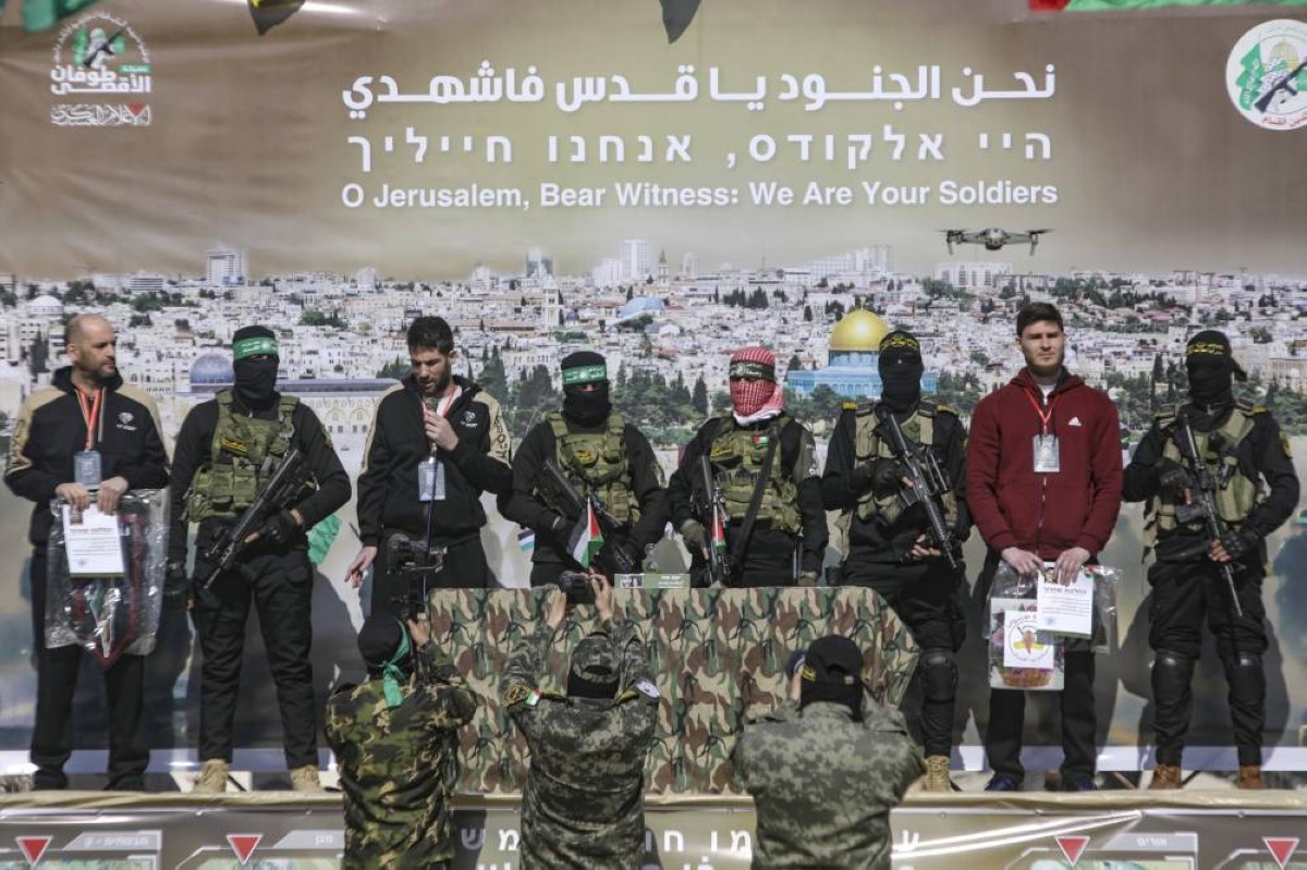 والرهائن الثلاثة هم الإسرائيلي الروسي ساشا تروبانوف والإسرائيلي الأمريكي ساغي ديكل حن والإسرائيلي الأرجنتيني يائير هورن الذين تمّ تسليمهم في مدينة خان يونس في جنوب القطاع، وأُصعدوا الى منصة وسط عشرات المسلحين الذين احاطوا بهم وأمام حشد من الأشخاص الذين كانوا يهتفون ويصفقون. ثم تسلمّتهم اللجنة الدولية للصليب الأحمر.