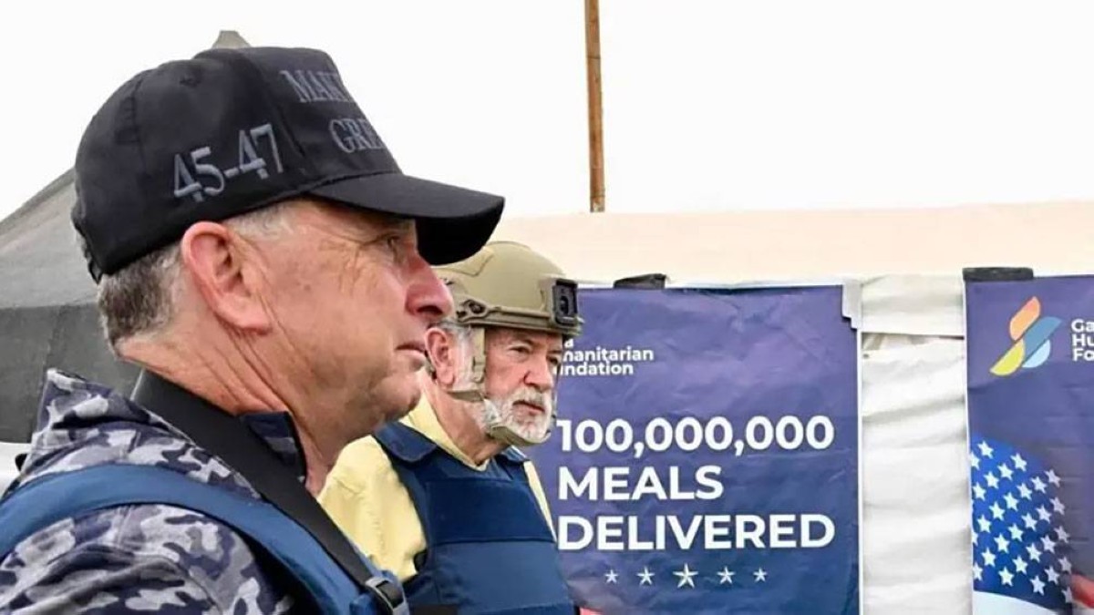 ونشر مايك هاكابي السفير الأمريكي لدى إسرائيل، الذي رافق ويتكوف إلى قطاع غزة اليوم، على إكس صورة تظهر سكان غزة الجائعين خلف أسلاك شائكة مع ملصق لمؤسسة غزة الإنسانية مع علم أمريكي كبير كتب عليه "تم تسليم 100 مليون وجبة".