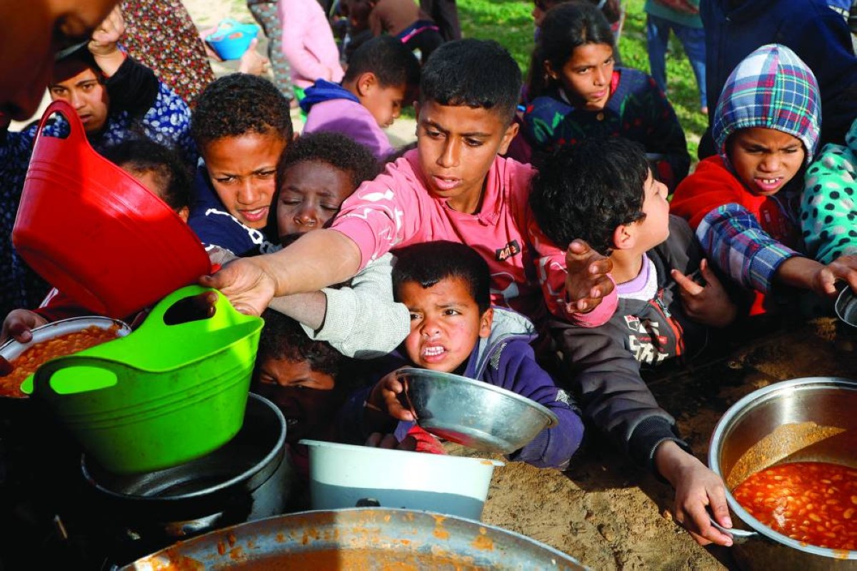 أطفال فلسطينيون يتزاحمون للحصول على وجبة إفطار رمضانية في خان يونس