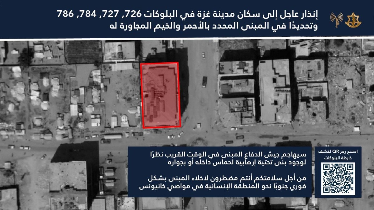 وقال المتحدث باسم الجيش الإسرائيلي أفيخاي أدرعي عبر منصة إكس "إنذار عاجل ومتكرر إلى سكان مدينة غزة (...) وتحديدا في عمارة الرؤيا (...) والخيم المجاورة لها والواقعة في مفرق بيروت وشارع جامعة الدول العربية".