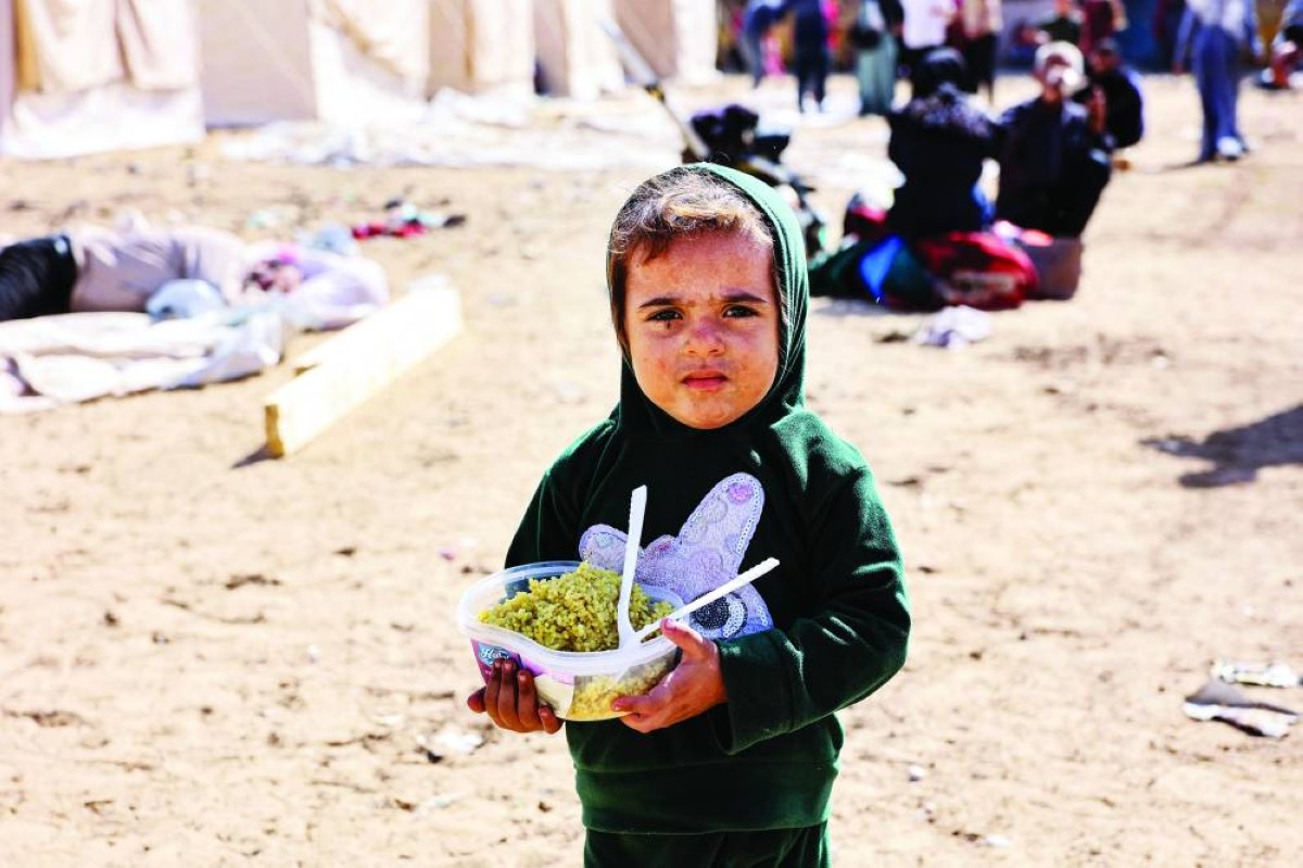 طفل فلسطيني نازح يحمل وعاء من الطعام