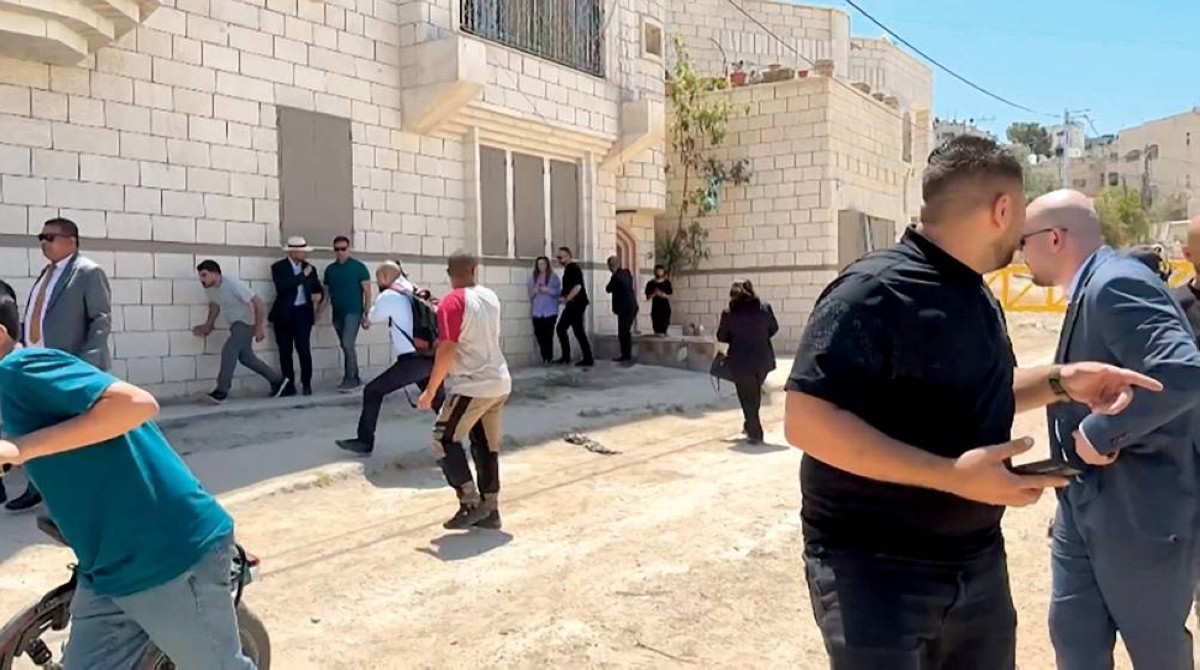 أعضاء الوفد الدبلوماسي يحاولون الاحتماء خلال إطلاق النار الإسرائيلي