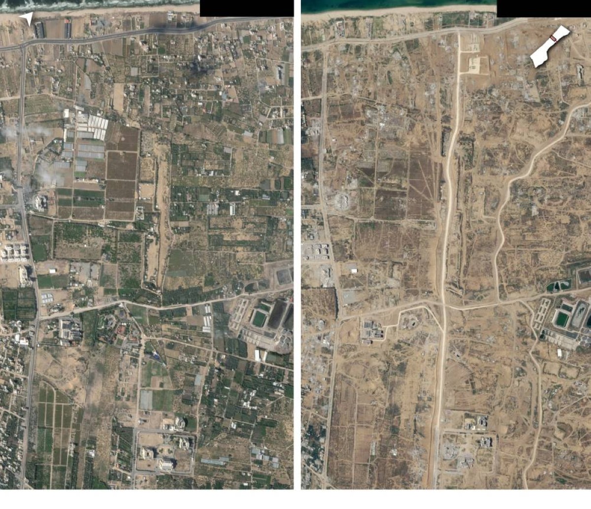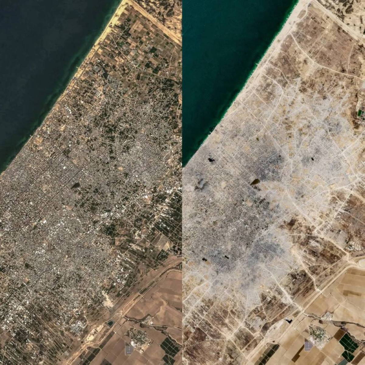 أظهرت صورتان التقطتهما الأقمار الصناعية مشاهد لمدينة غزة يوم 27 سبتمبر 2023، أي قبل أسابيع قليلة من شنّ حركة «حماس» هجومهاً المفاجئ على إسرائيل، ورداً على ذلك شنّت إسرائيل حربها على غزة، التي أسفرت عن مقتل أكثر من 66 ألف شخص، ونزوح الملايين، وتدمير القطاع الفلسطيني.
