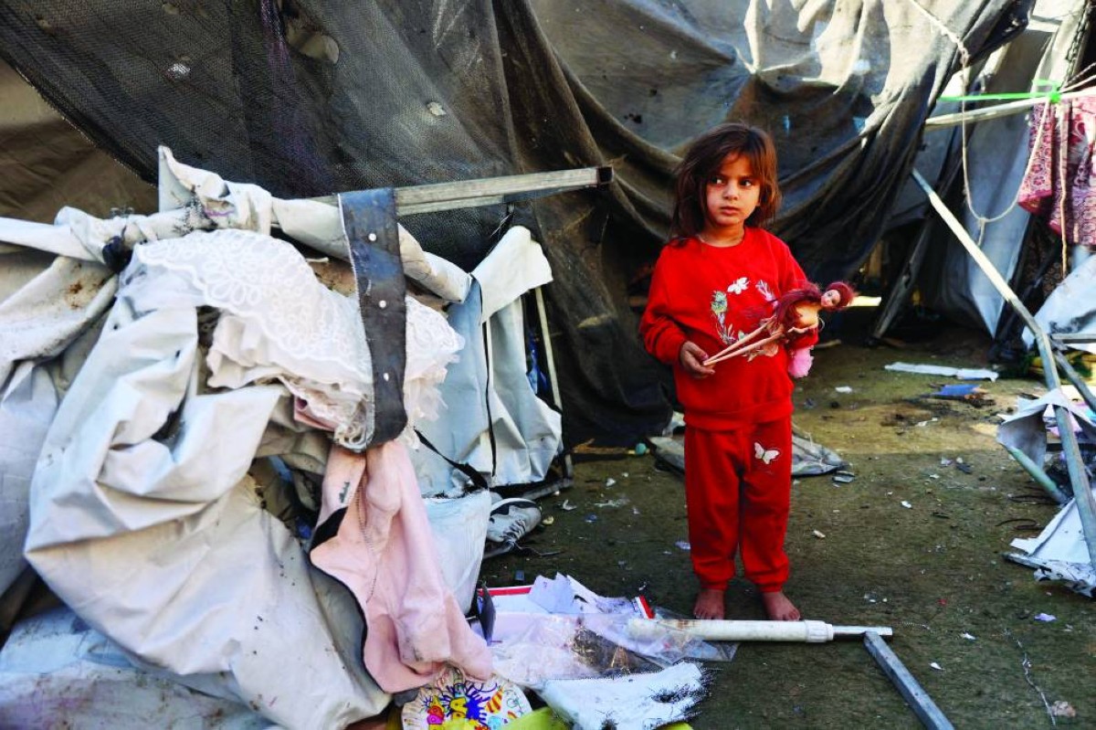 فتاة فلسطينية تقف بجوار خيمة متضررة جراء قصف إسرائيلي أصاب مخيماً للنازحين في شمال غزة